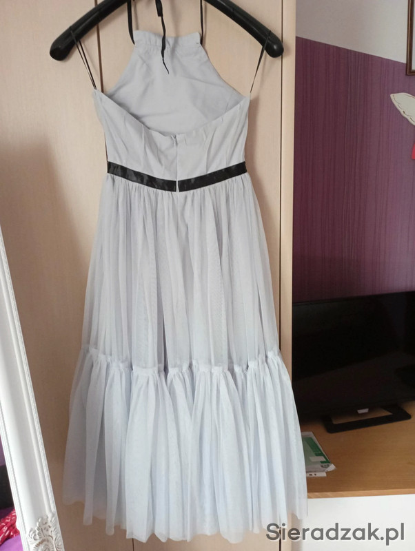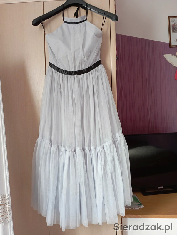 Marka-E.M.O, Rozmiar-36 ,Kolor-szary , Poliester 80%, wiskoza 20%. Sukienka założona raz, bez ramiączek, obowiązana czarna tasiemka wokół szyi, rozkloszowana, pod spodem halka, z odkrytymi plecami, idealna na wieksze uroczystości, pod pachami 43cmx2, w pasie 35cmx2, długość 117cm. Stan-bardzo dobry