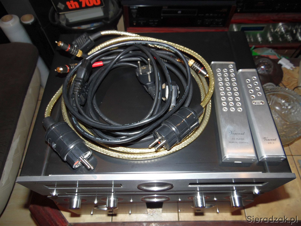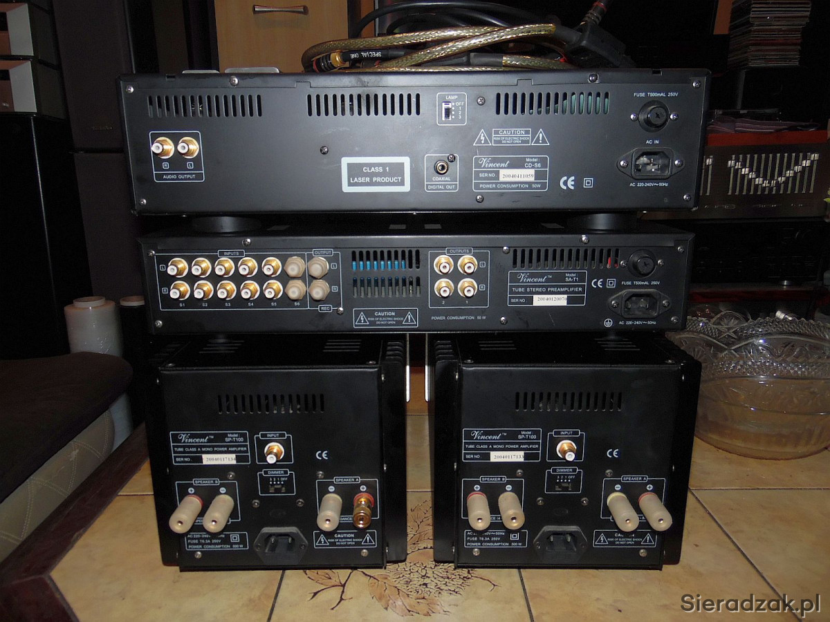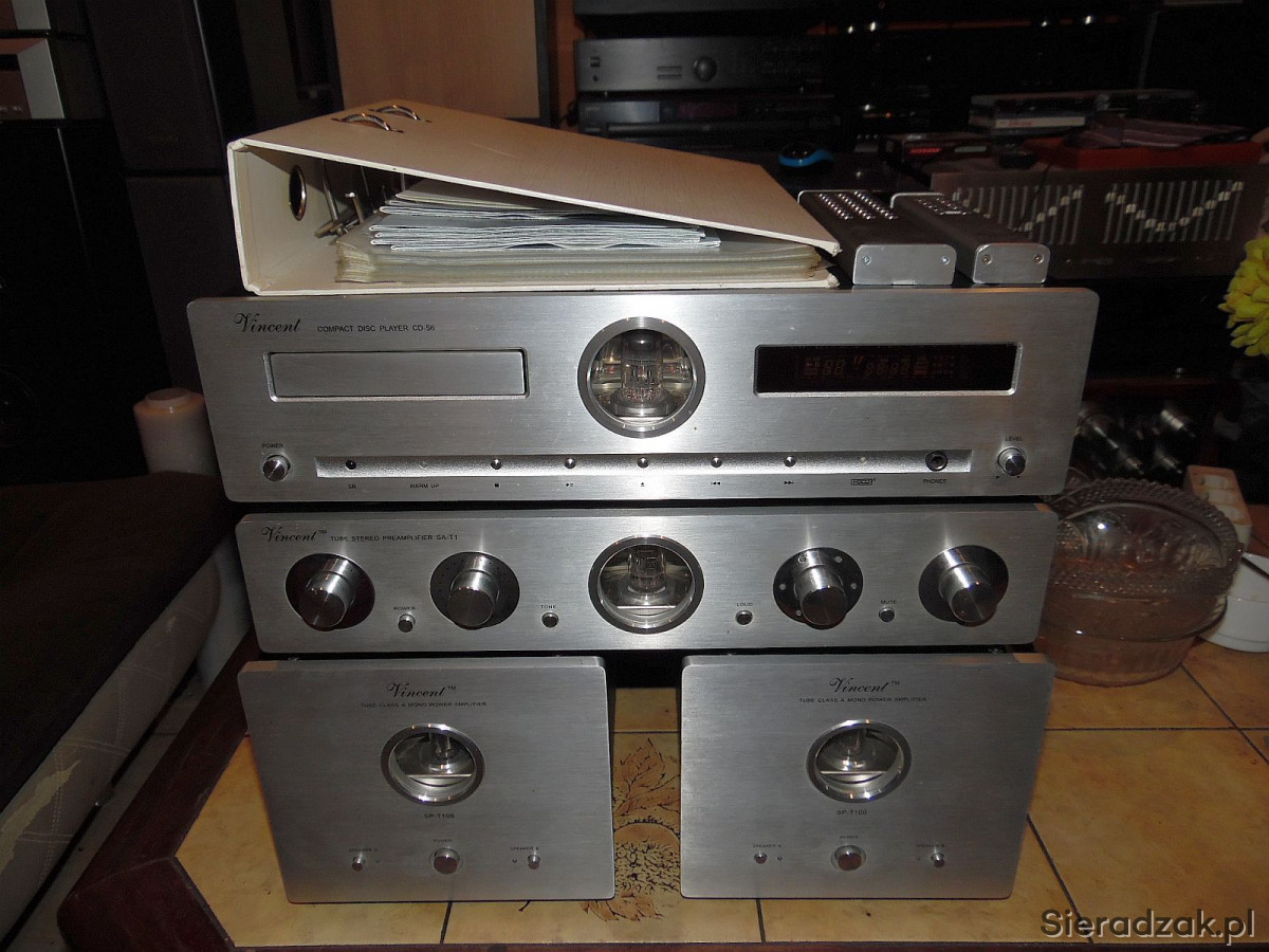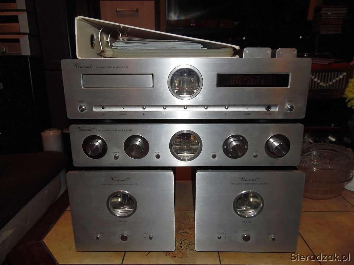 Wysokiej klasy audiofilski zestaw audio. Hybryda Vincent SA-T1 przedwzmacniacz z pilotem + 2 końcówki mocy monobloki 2xSP-T100 2x200Watt 4ohm 2x100Watt 8ohm odtwarzacz CD-S6 Lampowy z pilotem. W komplecie wysokiej klasy okablowanie i papiery dokumenty. Zestaw od 1 właściciela.