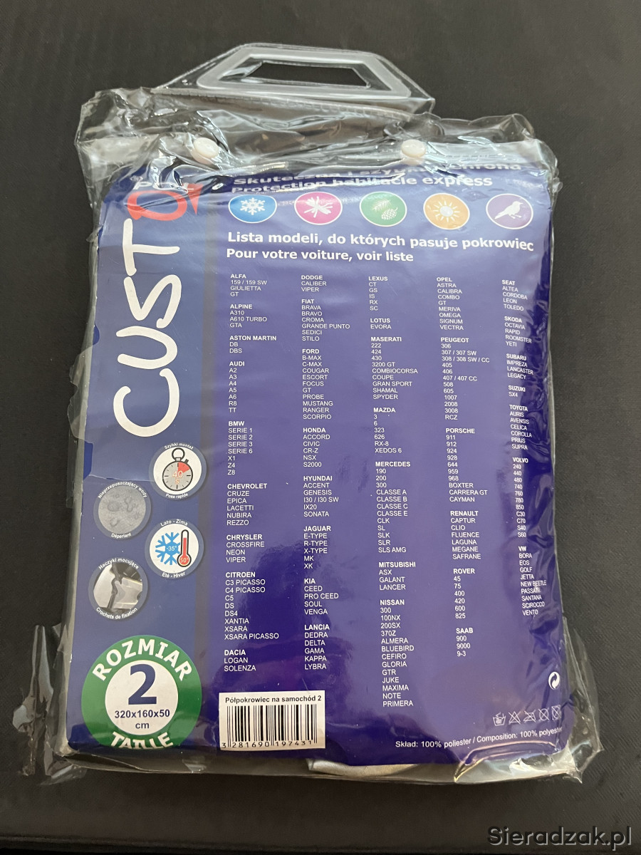 Do sprzedania nowy pokrowiec na samochód w rozmiarze 320x260x50cm. Wykaz samochodów na które pasuje pokrowiec znajduje się na zdjęciu.
