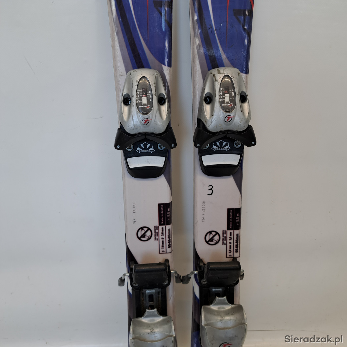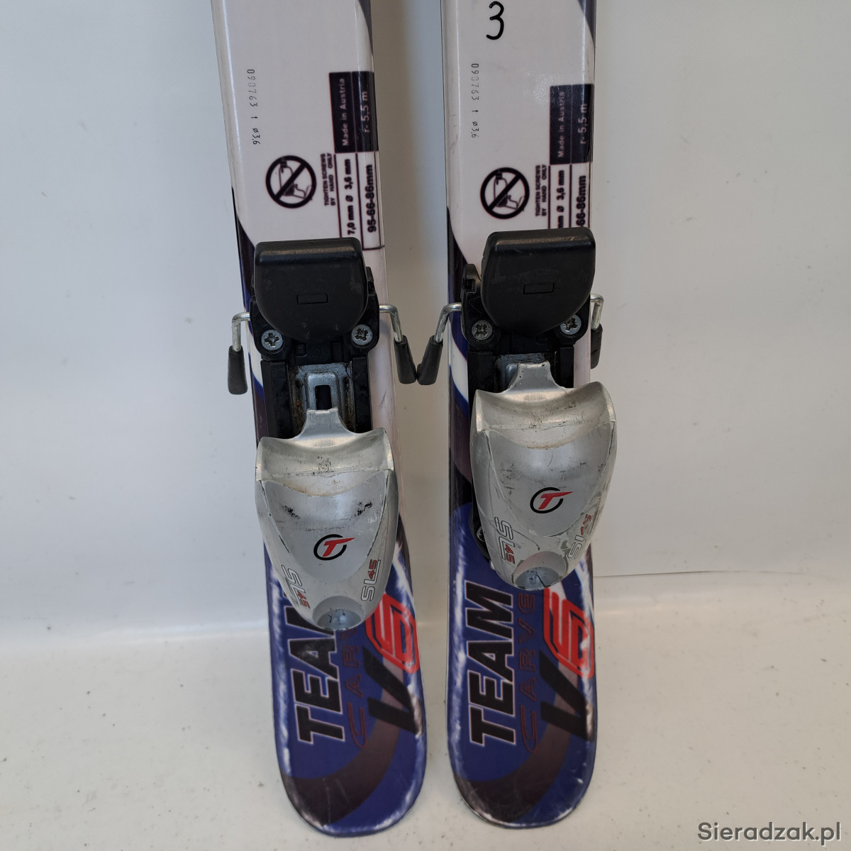 używane narty o długości 90cm,taliowanie 95-66-86,promień skrętu 5.5m,wiązanie TYROLIA SL 45 z siłą wypięcia 0.75-4.5 din.ślizgi w dobrym stanie,wizualnie ślady normalnego użytkowania.