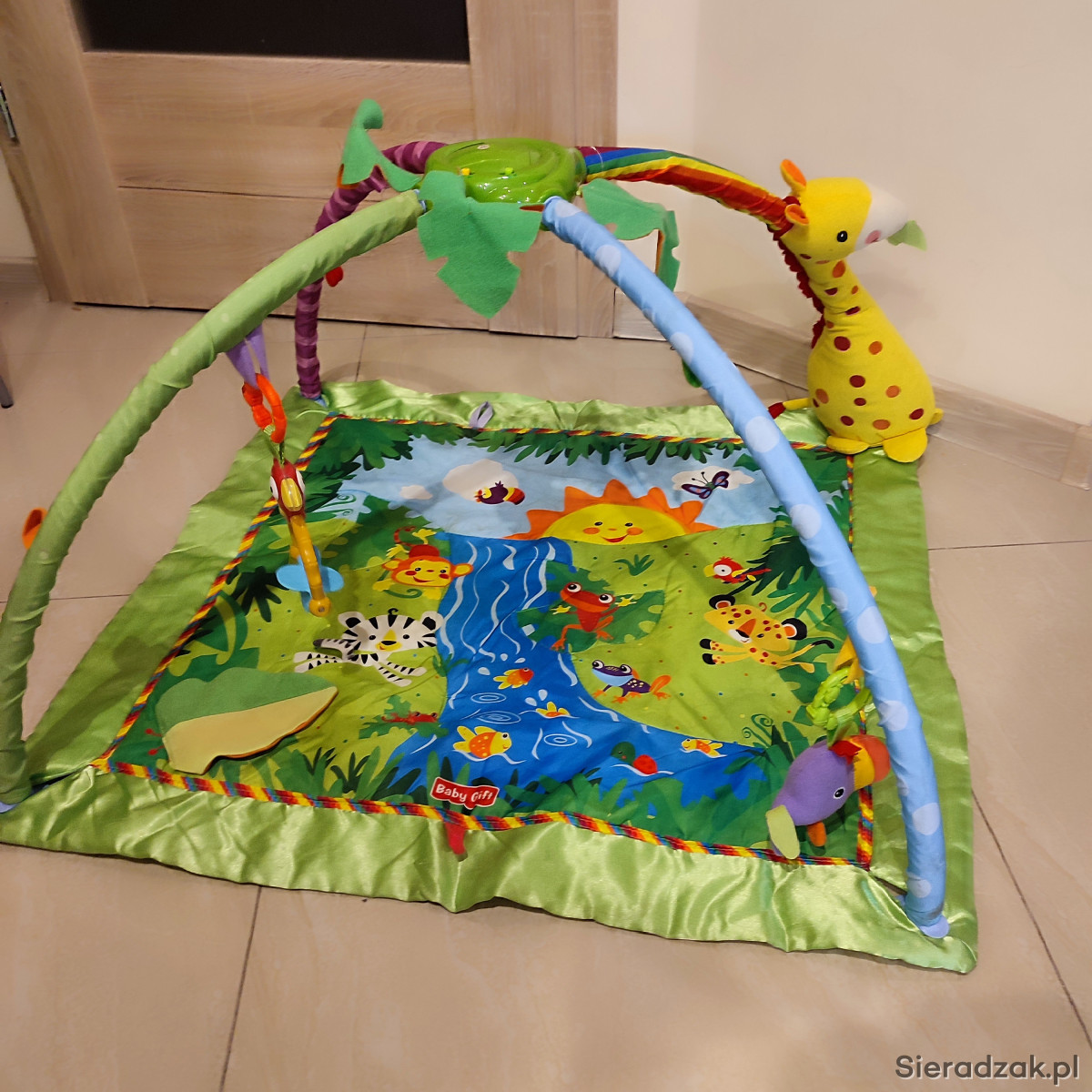 Doskonała dla dzieci już od pierwszych chwil życia. Gdy dziecko leży na plecach nad jego główką znajduje się karuzela (obracana ręcznie) z kolorowymi motylkami.