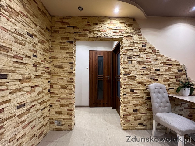 Na ścianach starannie położone gładzie, tynki strukturalne oraz kamień ozdobny.