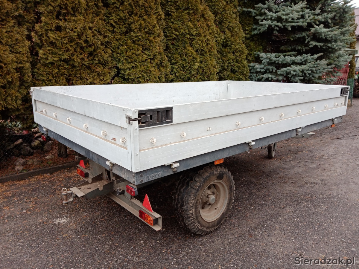 Witam, mam do sprzedania przyczepę jednoosiową sztywną w bdb stanie. Nowe opony 12 PR ,,Stomil" 10x15.3 + nowe dętki. Zaczep z tyłu wraz z gniazdem, nowa instalacja elektryczna. Oryginalna skrzynia ładunkowa od Iveco Daily (346x213x40), burty aluminiowe, na spodzie jednolita sklejka wodoodporna o gr. 15 mm. Przyczepa cały czas garażowana, używana raz w roku podczas żniw. Polecam.