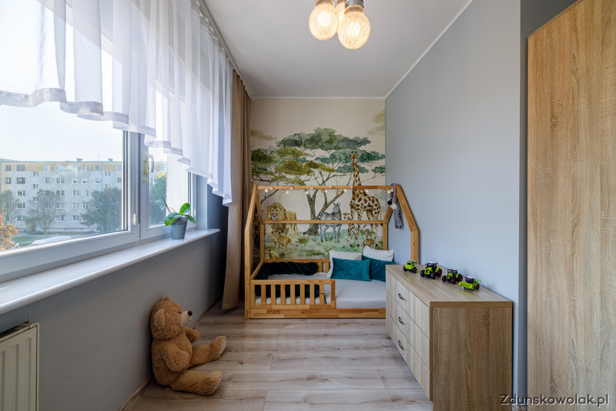 Przytulna sypialnia (14 mkw) jest obecnie pokojem dla dziecka. Wpadają tu promienie słońca od samego rana, gdyż okno mieści się od wschodniej strony bloku. Jest tutaj niewielka szafa, dwie komody, a także łóżko.