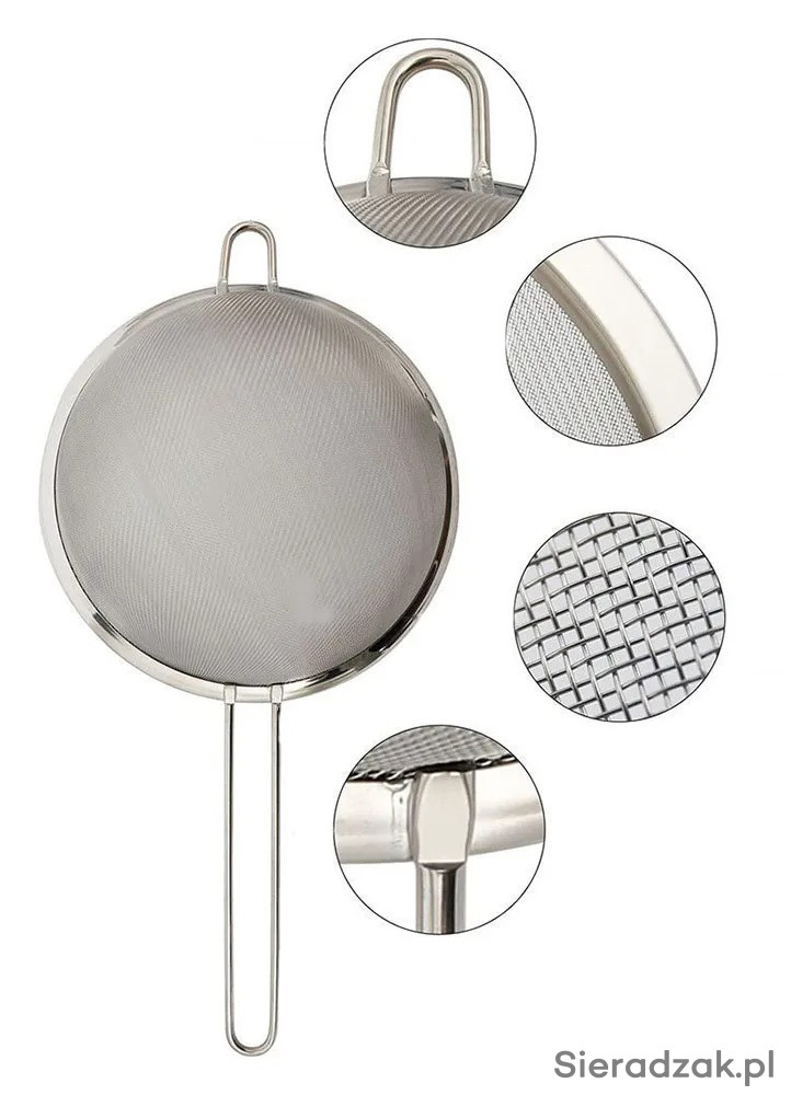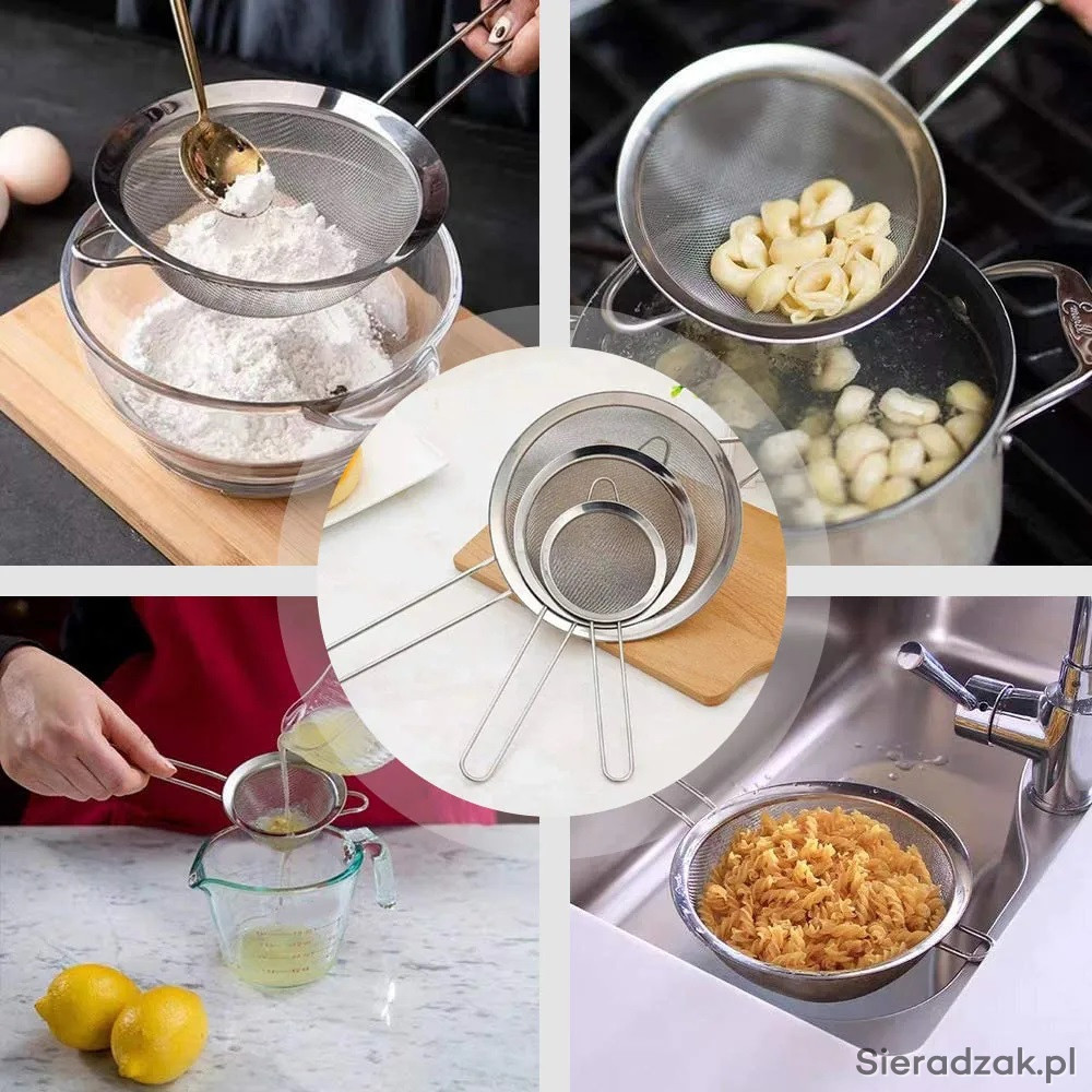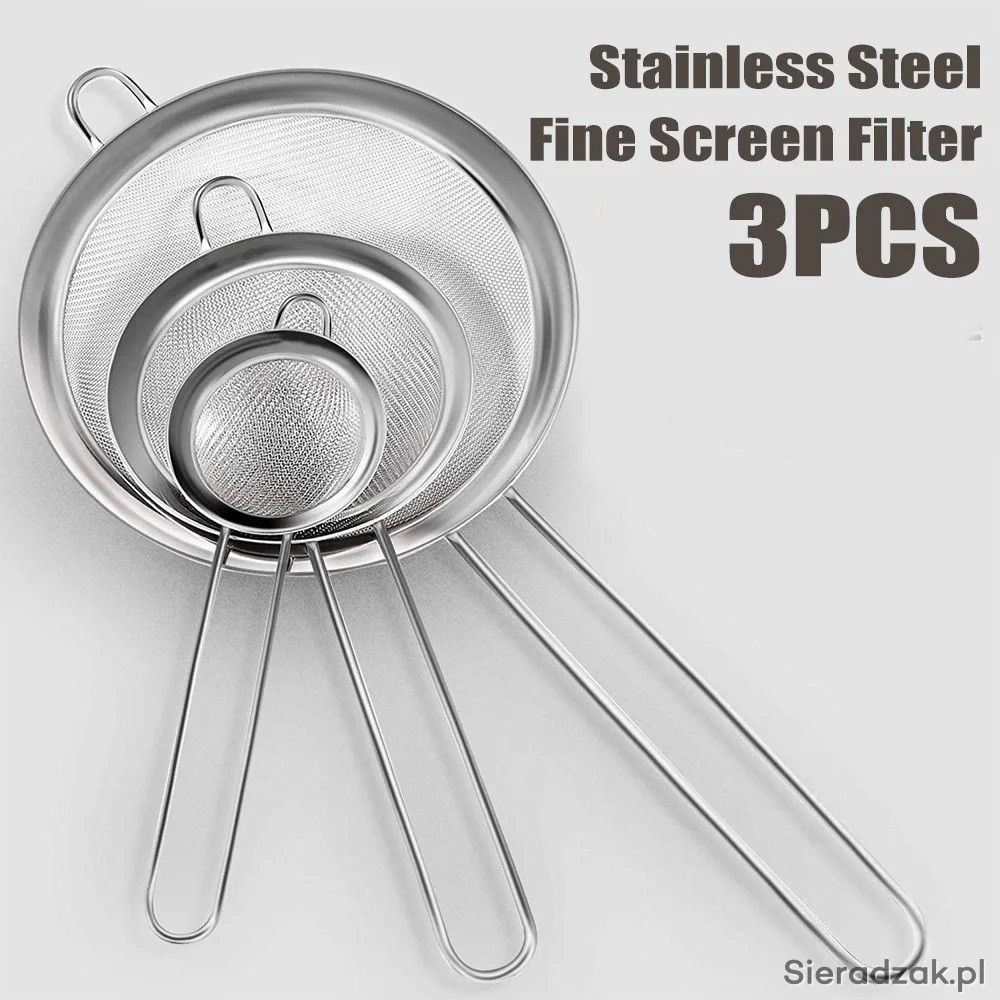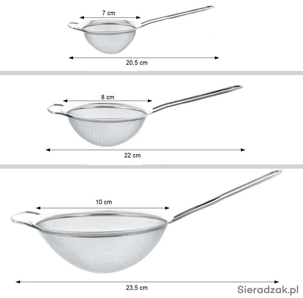 Oferta dotyczy zestawu trzech sitek z drobnymi oczkami. Wykonane z wysokiej jakości stali nierdzewnej.