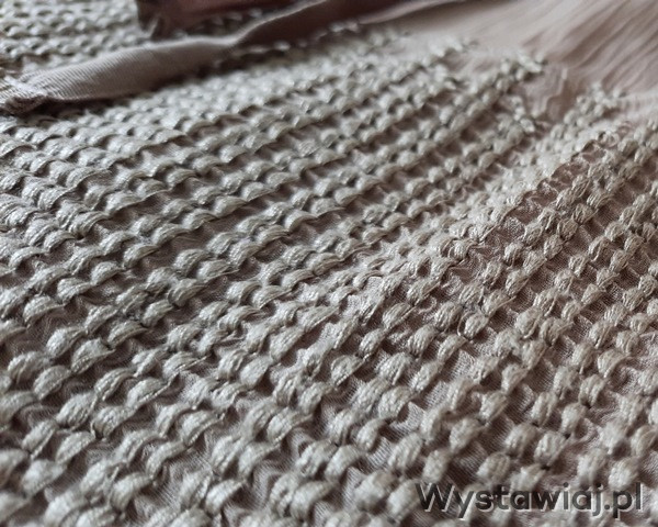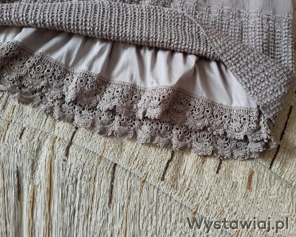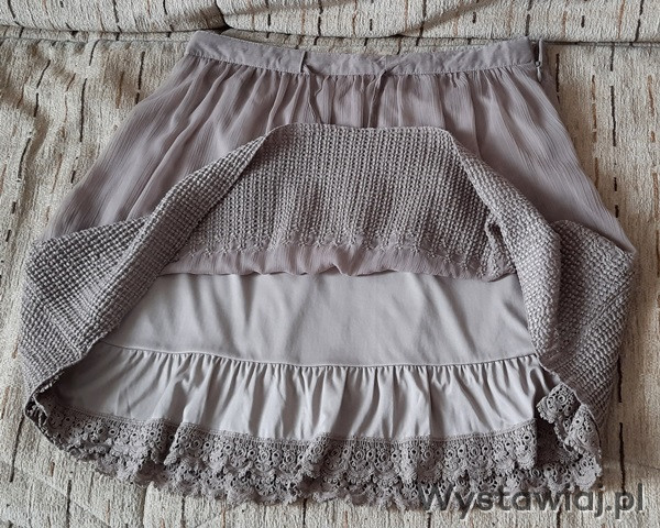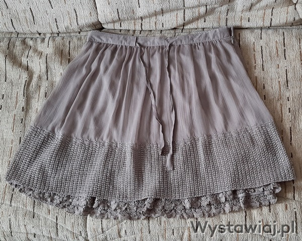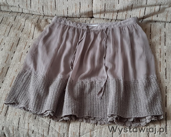 Witam. Do sprzedania: fantazyjna, bardzo dziewczęca SPÓDNICA na podszewce (z falbaną), zakończona szerokim przetykanym/haftowanym wzorem, z boku suwak, w pasie ściągana troczkami (obwód regulowany). Przybliżone wymiary: długość całkowita 45 cm, obwód pasa max. 86 cm. Kolor beżowy/kawa z mlekiem (podszewka tego samego koloru), rozmiar M. Spódnica bardzo efektowna, ślicznie prezentuje się w ruchu, można prać w pralce, stan bardzo dobry – jak nowa. Cena 25 zł. + 9 zl. koszty wysyłki. Tel. 507-694-505.