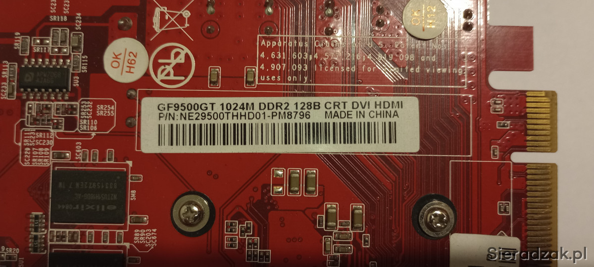 Na sprzedaż posiadam w 100% sprawną kartę graficzną nVidia GeForce 9500GT firmy GAINWARD z 1GB DDR2 pamięci VRAM. Karta pasywnie chłodzona, więc cicha, pobiera nie wiele prądu i nie wymaga dodatkowego zasilania. Dodatkowo posiada komplet wyjść: HDMI, DVI, VGA.