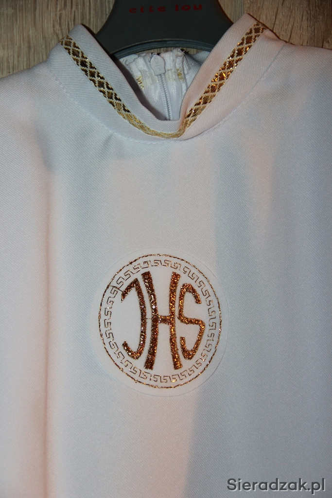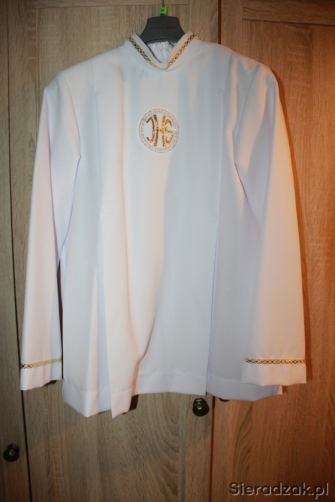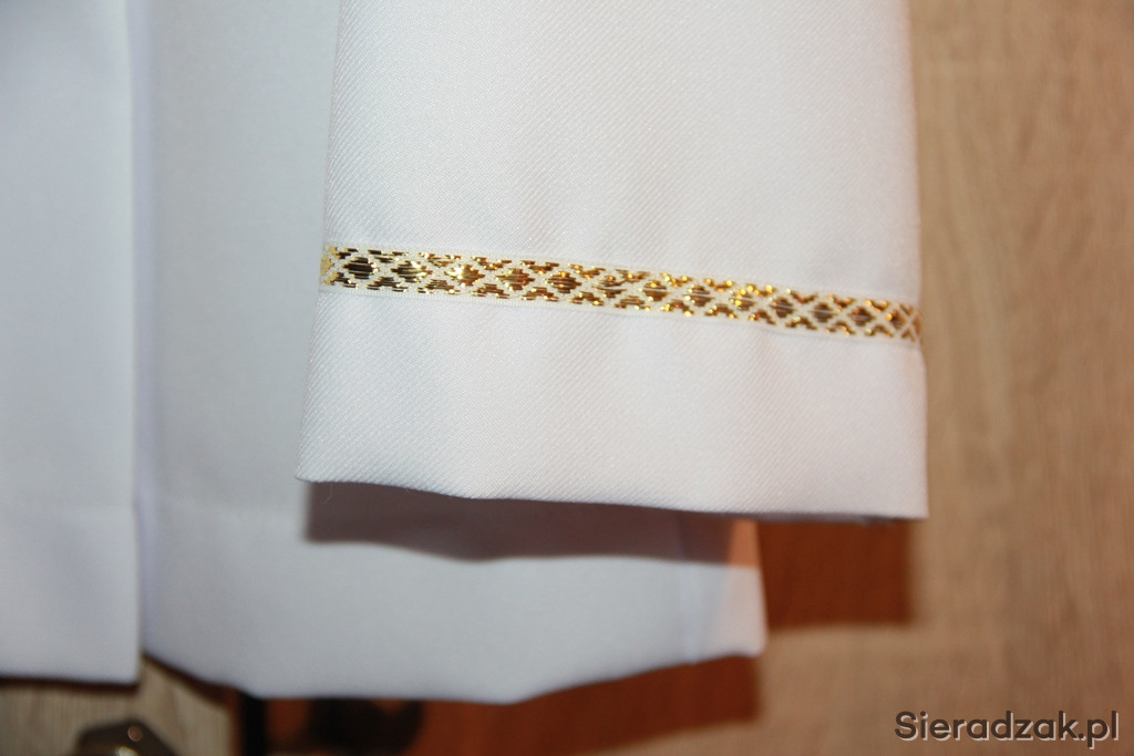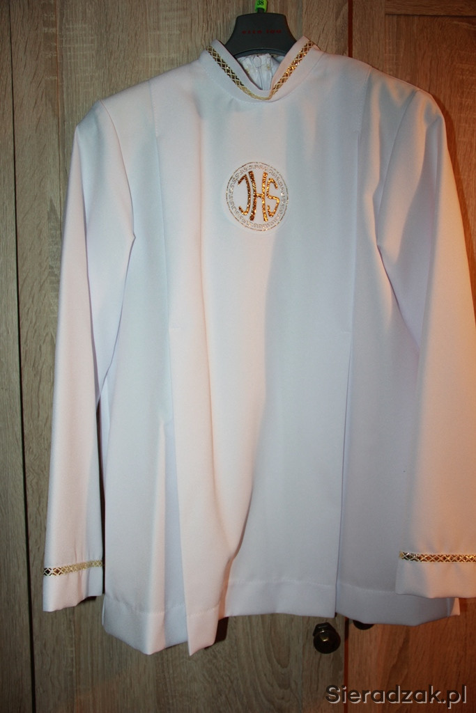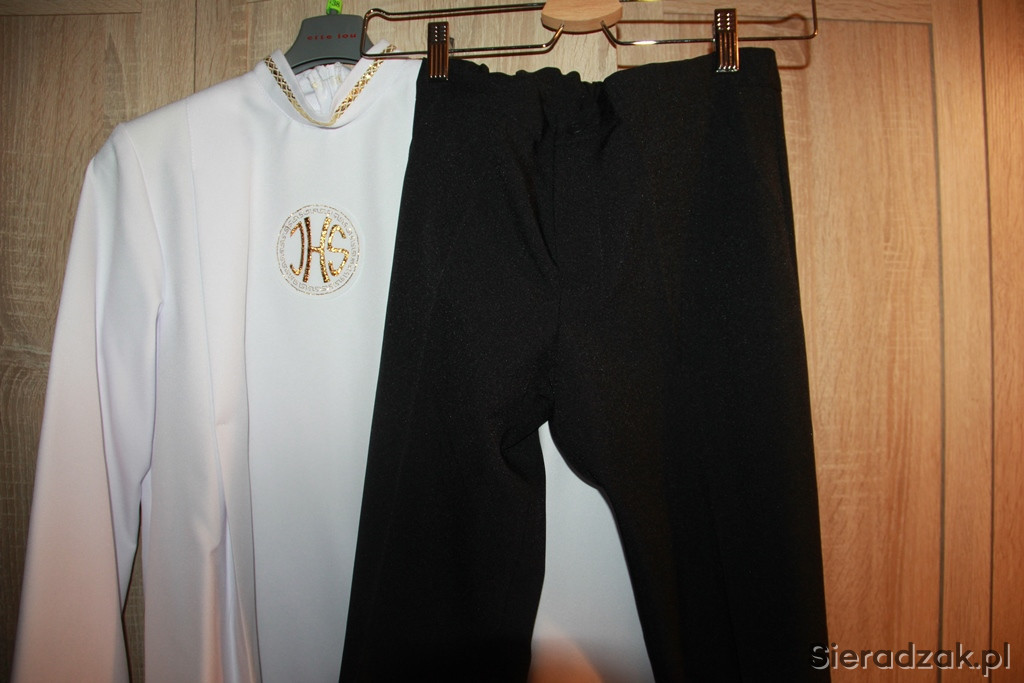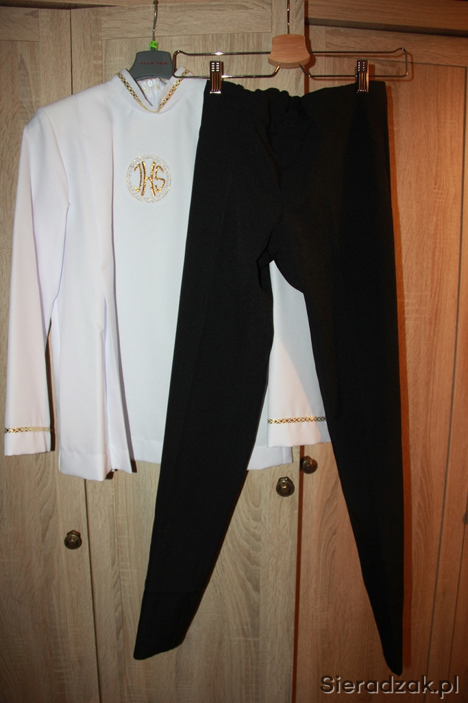 Komża- krótka alba- i spodnie komunijne rozmiar 140 cm. Wymiary: Długość 63 cm, szerokość 45 cm, długość rękawa 53 cm, obwód kołnierzyka 35 cm. Długość spodni : podwinięte 82 cm, odwinięte 95 cm, szerokość w pasie 32 cm do max 37 cm ( w pasie z tyłu wszyta gumka więc dodatkowo się rozciągają). Stan idealny.