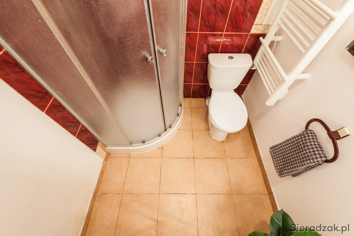 Łazienka wyposażona jest w kabinę prysznicową, umywalkę i toaletę, zapewniając funkcjonalność i komfort codziennego użytkowania.