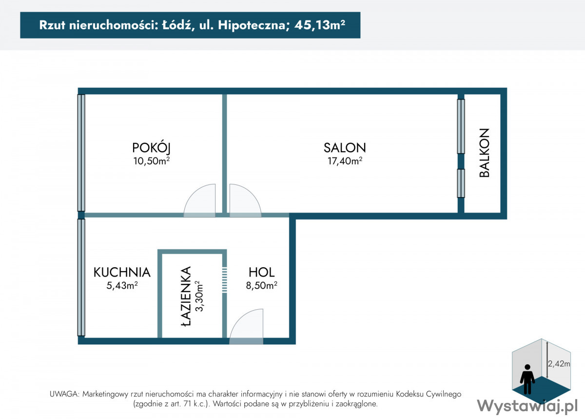 Oferuję na sprzedaż 2-pokojowe mieszkanie o powierzchni 45,13 m2. Mieści się na 1 piętrze 4-piętrowym bloku z 1970 roku. Położone w Łodzi na osiedlu Stare Bałuty przy ul. Hipotecznej.