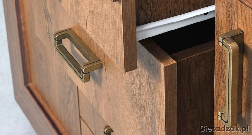 Kolekcja Tadeusz to wyjątkowe meble klasyczne dostępne w dwóch wariantach kolorystycznych - dąb lefkas i dąb stuletni. Meble wykonane są z 16 mm laminowanej płyty wiórowej oraz są zakończone odporną okleiną PCV. Unikatowy styl i oryginalność zestawu podkreślają metalowe uchwyty.