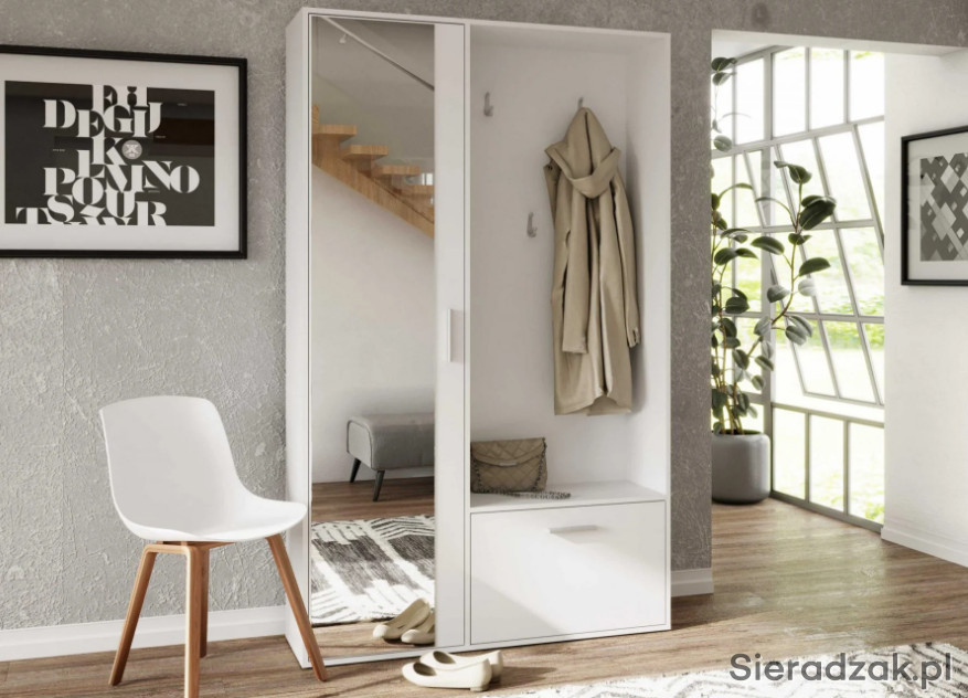 Garderoba z lustrem, oraz zabudowaniem BIS. Posiada na zewnętrznej stronie trzy wieszaki, idealne na kurtki, płaszcze czy bluzy i torebki. Poniżej znajduje się szafka na buty z przegrodą, co ułatwia organizacje. Szafa po lewej stronie posiada w sobie dwie półki. Jedną do góry a drugą na dole, pozwala to na umieszczenie na nich rzeczy, które wymagają położenia na płaskiej powierzchni. Nowoczesną opcją jest wysuwany wieszak, uwydatniający unikalność i funkcjonalność szafy. Dostępna w sześciu wybarwieniach.