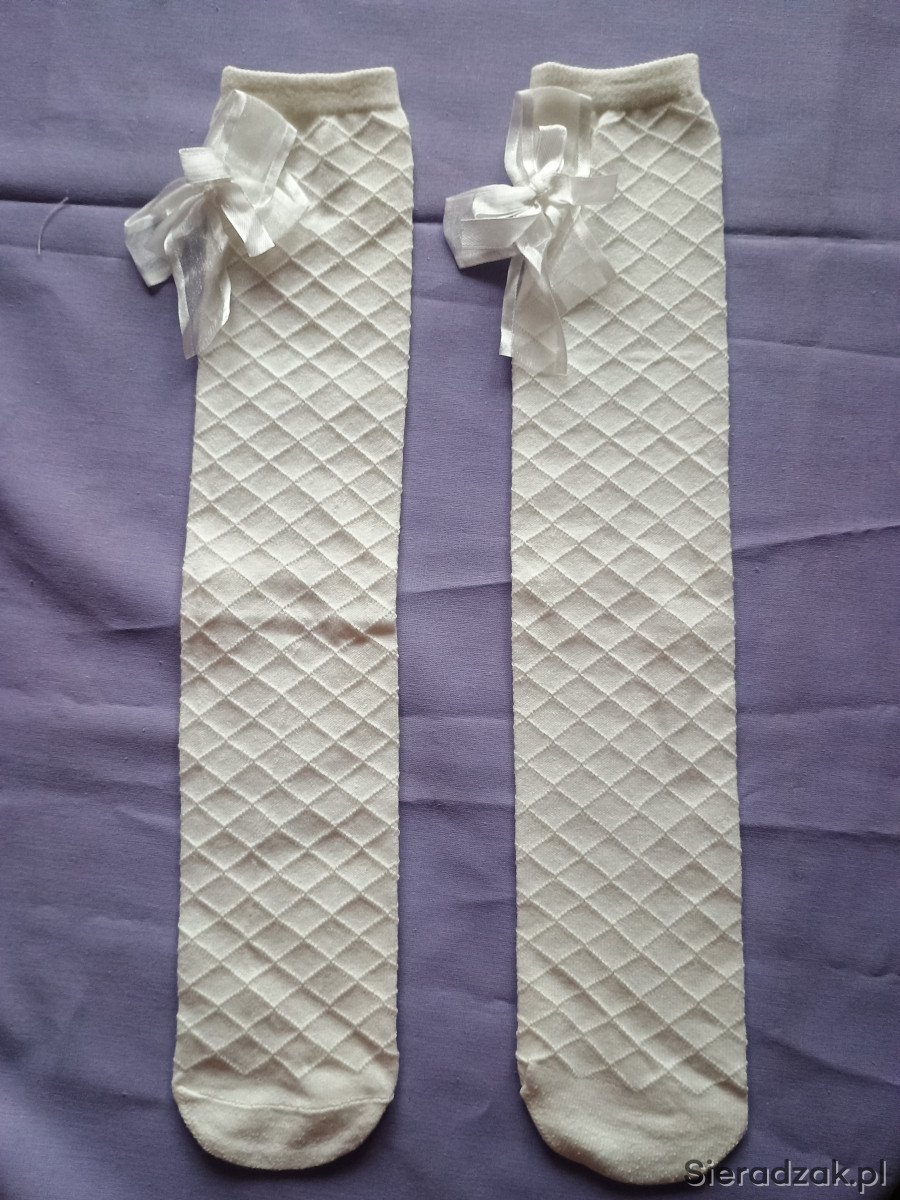BIAŁE PODKOLANÓWKI W KRATKĘ Z KOKARDKĄ