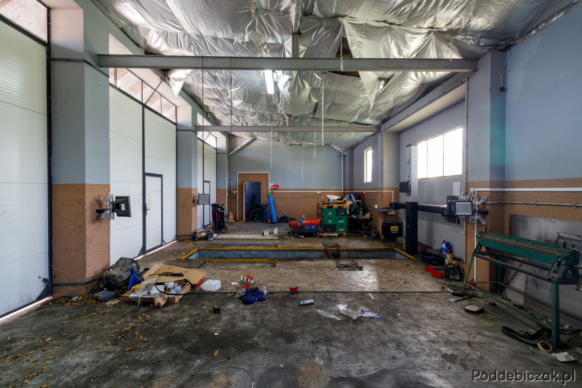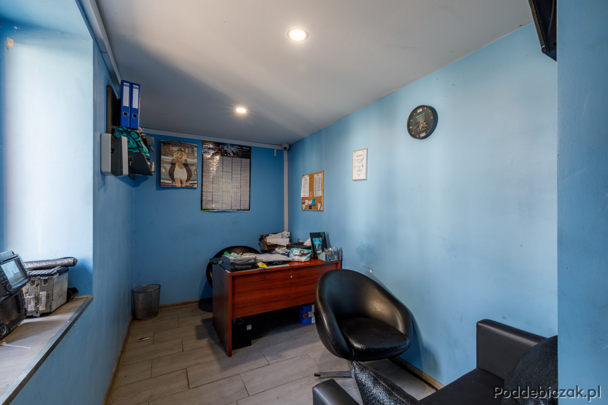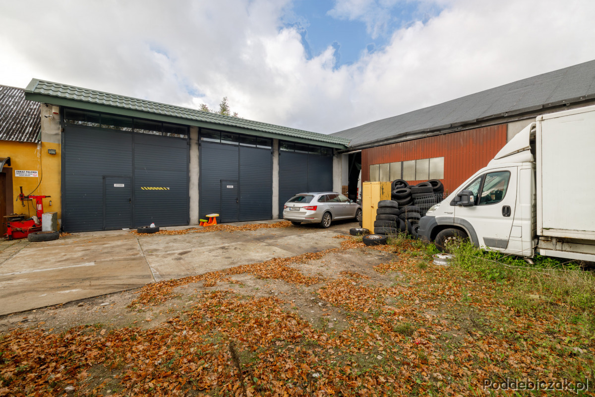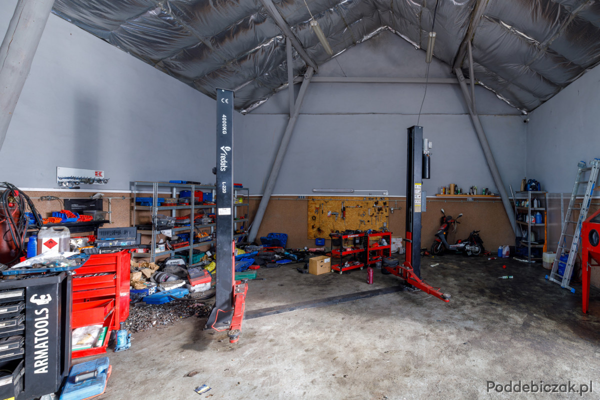 Poruszając się po nieruchomości z łatwością można docenić pomysł, z jakim wszystko zostało wybudowane. Obiekt składa się z dwóch wydzielonych części: mieszkalnej i usługowej. Do części usługowej należą pomieszczenia socjalne i biuro, z którego jest bezpośrednie przejście do warsztatu. Część usługowa to także warsztat, który posiada 3 stanowiska naprawcze. Każde z nich zostało wyposażone w wysoką bramę garażową. Dodatkową zaletą warsztatu jest kanał samochodowy. Do części usługowej zalicza się również hala z dużą bramą przesuwną, w której znajdują się dwa podnośniki kolumnowe (4 oraz 5 ton). Obie części są wydzielone za pomocą ścian, dzięki czemu część mieszkalna jest dyskretnie oddalona od części usługowej, co zdecydowanie wpływa na komfort codziennego funkcjonowania.