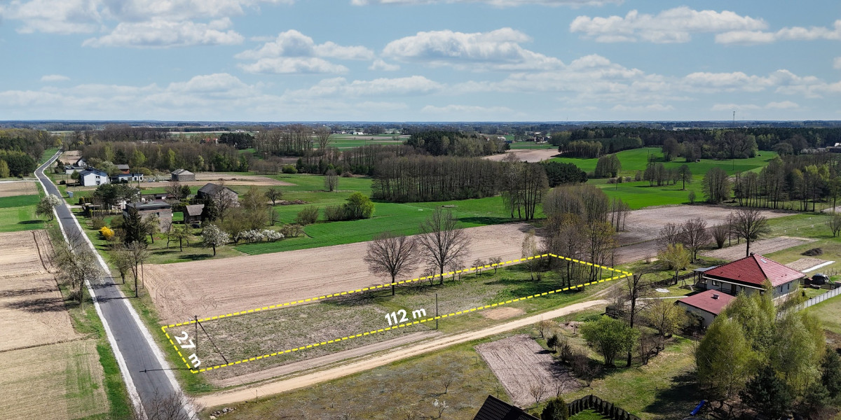 Działka w kształcie prostokąta o szerokim froncie i wymiarach ok. 27m x 111m.