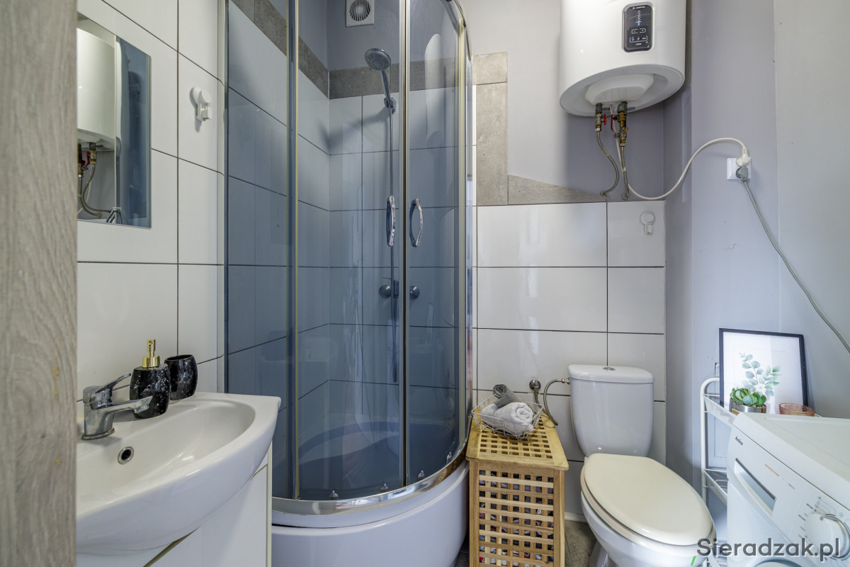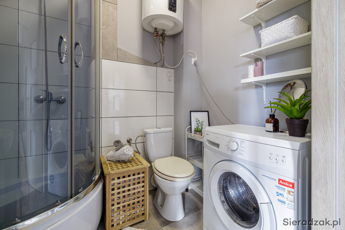 Łazienka posiada prysznic, umywalkę, WC i pralkę.