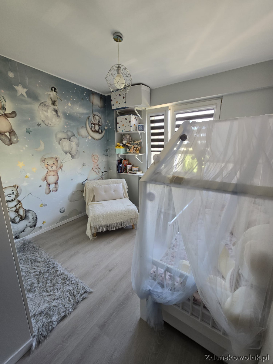 Pokój II - z oknem wyposażonym w roletę dzień/noc, ściany pomalowane, jedna ze ścian z tapetą z motywem dziecięcym, na podłodze panele.