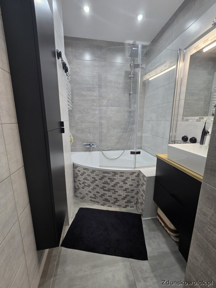 Łazienka – duża narożna wanna, szklany parawan nawannowy, umywalka z szafką + słupek, osobno WC wyposażone w umywalkę z szafką.
