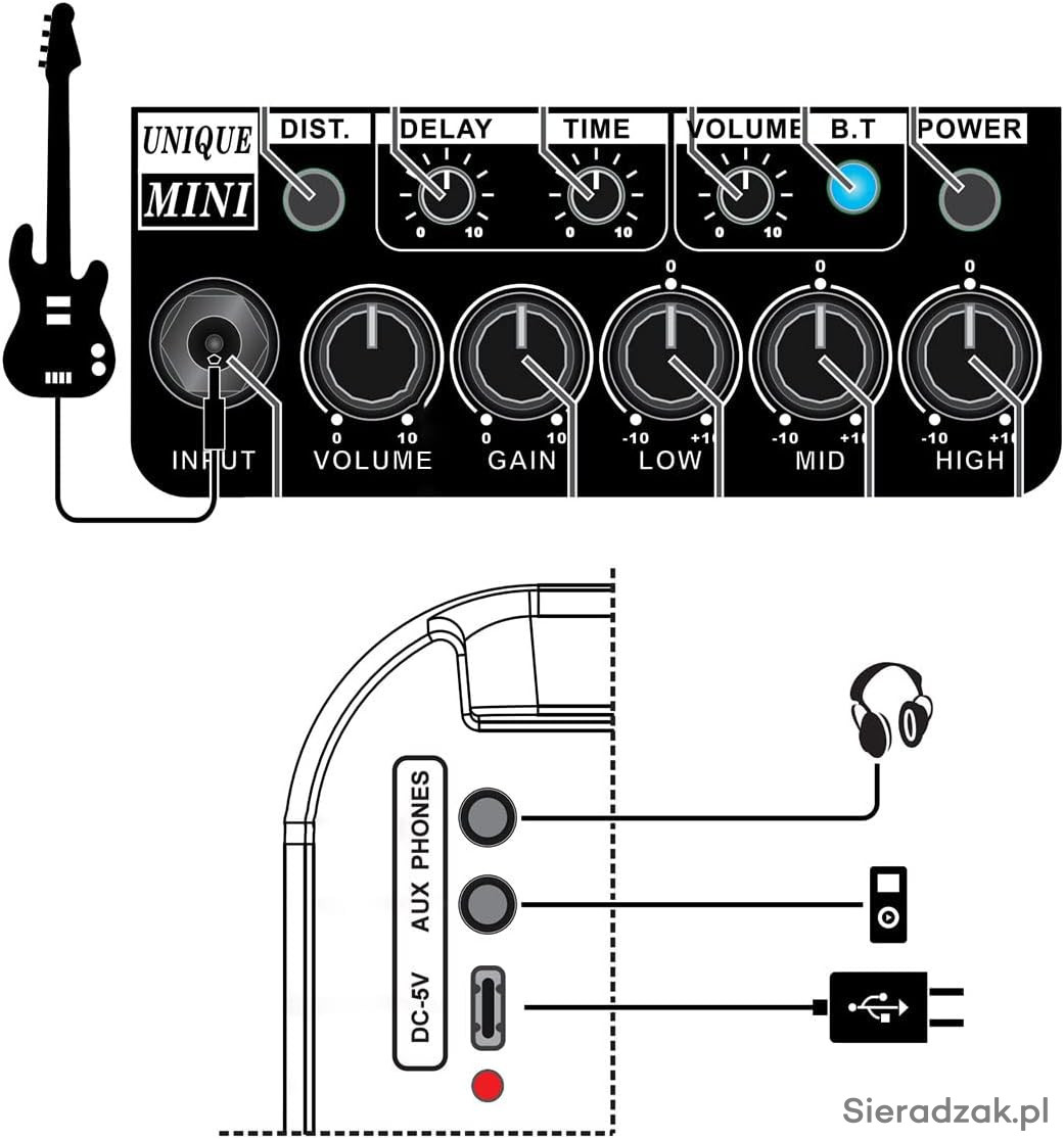 Regulacja: Volume, Gain, Low, Mid, High