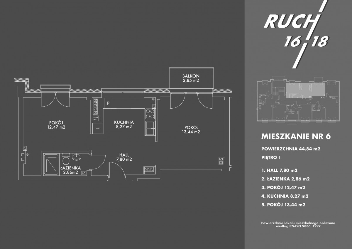 PRZESTRZEŃ DOKŁADNIE TAKA JAK TY. Szukasz wygodnej kawalerki w centrum miasta? A może wygodnego lokalu, który będzie jednocześnie domem i biurem? Przestrzennego mieszkania, w którym pomieści się rodzina i dwa psy? W inwestycji „RUCH 16-18” znajdziesz mieszkania jedno-,dwu-, i trzy pokojowe od 29-62 m2. Funkcjonalne, ustawne mieszkania, które łatwo urządzisz, zgodnie ze swoimi upodomaniami i gustem. Dogodne usytuowanie budynku sprawia, że wszędzie masz blisko: nie musisz spędzać życia w samochodzie albo komunikacji miejskiej, aby dostać się tam, gdzie chcesz być. Monitorowane miejsce parkingowe na dziedzińcu nieruchomości dedykowane do każdego lokalu mieszkalnego rozwiąże problemy z parkowaniem twojego pojazdu. Lokale w tej inwestycji zostały wykonane z zastosowaniem produktów wiodących producentów branży budowlanej takich jak VEKA (OKNA TRZYSZYBOWE), KMT STAL ( DRZWI WEJŚCIOWE DO LOKALI MIESZKALNYCH), KNAUF ( TYNKI GIPSOWE I SYSTEM OCIEPLENIA), ALUPROF( STOLARKA ALUMINIOWA) CERAMIKA TUBĄDZIN ( PŁYTKI CERAMICZNE). Dołożyliśmy wszelkich starań aby prace budowlane zostały wykonane z ogromną starannością i funkcjonalnością. Nowoczesna, dobrze doświetlona, przestronna klatka schodowa z szerokimi schodami prowadzącymi do lokali daje poczucie ogromnej swobody poruszania się po kondygnacjach budynku, a nowoczesne wykończenie części wspólnych sprawia że odczuwamy komfort przestrzeni, bardzo potrzebnej do codziennego funkcjonowania w budynku wielorodzinnym. Wszystkie lokale zostały wyposażone w klimatyzatory inwerterowe posiadające funkcję chłodzenia oraz grzania zapewniające komfort termiczny. Media dla inwestycji: Energia elektryczna PGE Sp. z o.o. Ogrzewanie gazowe PSG Sp. z o.o. - indywidualne dla każdego lokalu, piec dwu-funkcyjny z możliwością dołożenia automatyki SMART, w celu optymalnego i indywidualnego zarządzania temperaturą w lokalu. Budynek będzie przekazany w zarządzanie Wspólnocie Mieszkaniowej, co spowoduje że mieszkańcy będą mięli realny wpływ na podejmowanie decyzji dotyczących kosztów funkcjonowania inwestycji. Lokale Mieszkalne spełniają wymogi techniczne pomieszczeń przeznaczonych na stały pobyt ludzi, określone w przepisach ustawy z dnia 7 lipca 1994 r. Prawa Budowlanego.
