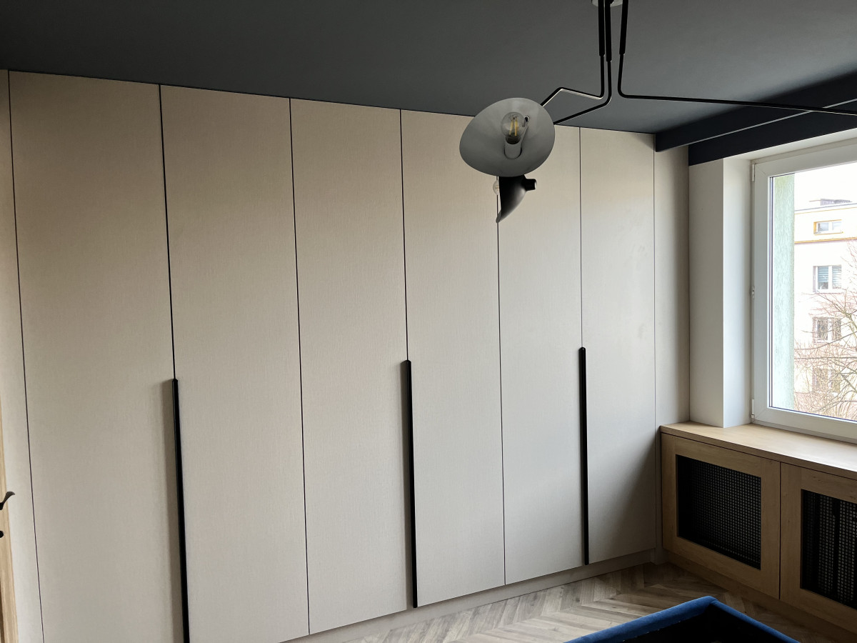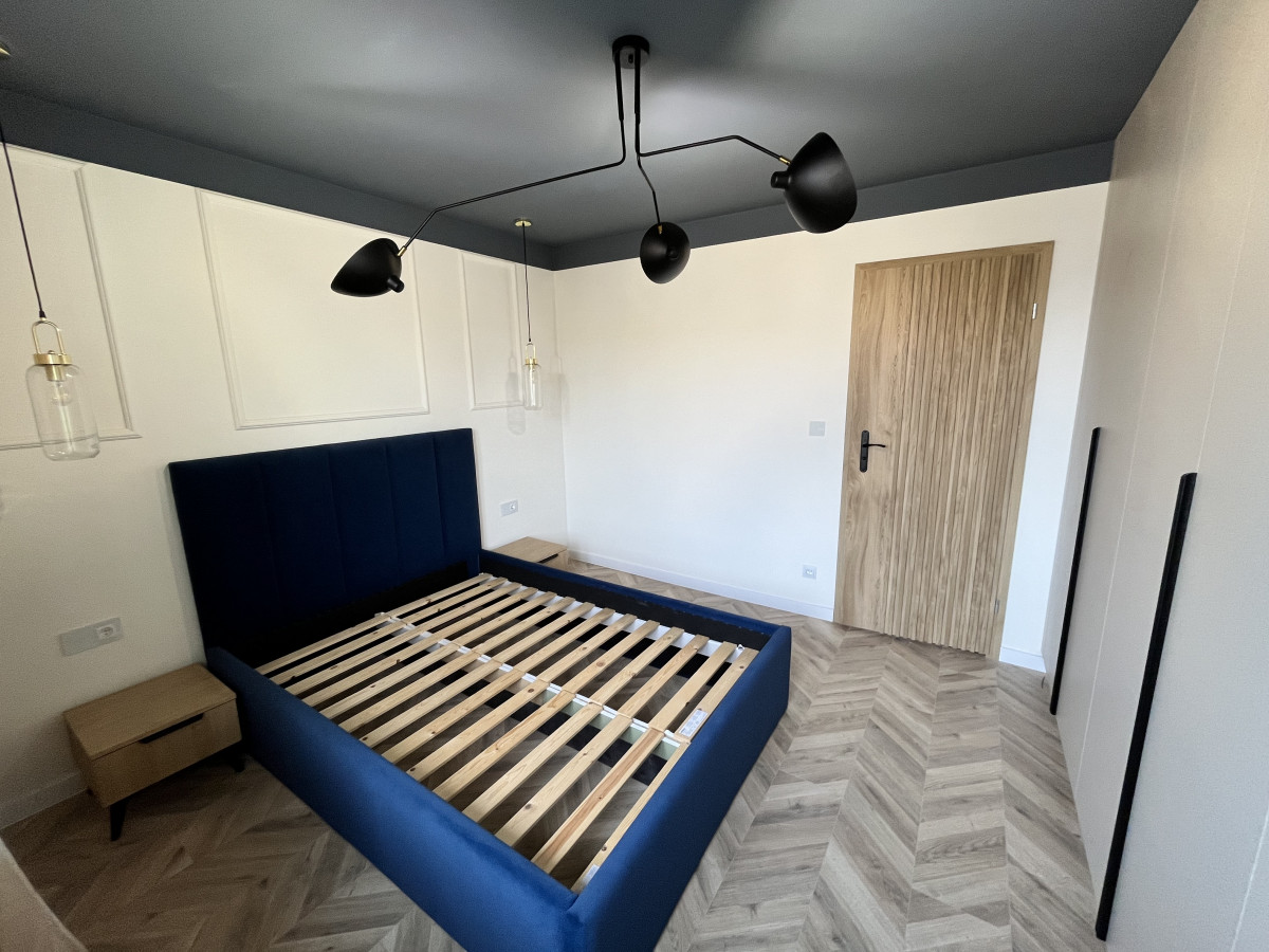 3. W Sypialni rządzą mocne granaty . Tapicerowane łóżko na tle sciany ze sztukaterią. Dodatkowo szafa w zabudowie.