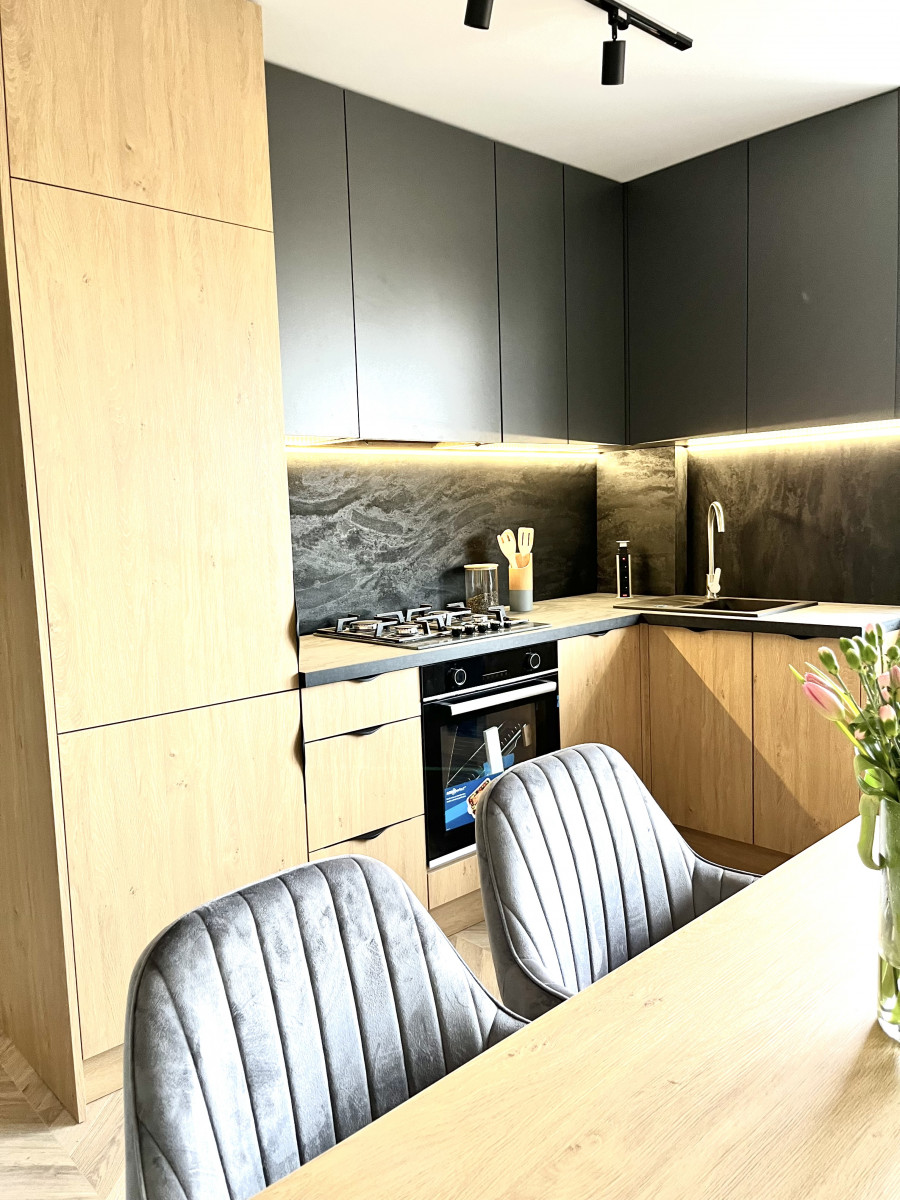 Kuchnia w kolorze szarości w połączeniu z ciepłym drewnem zachwyca harmonijną aranżacją, z której bije spokój i domowe ciepło.