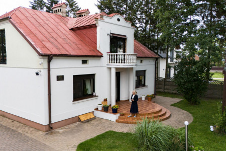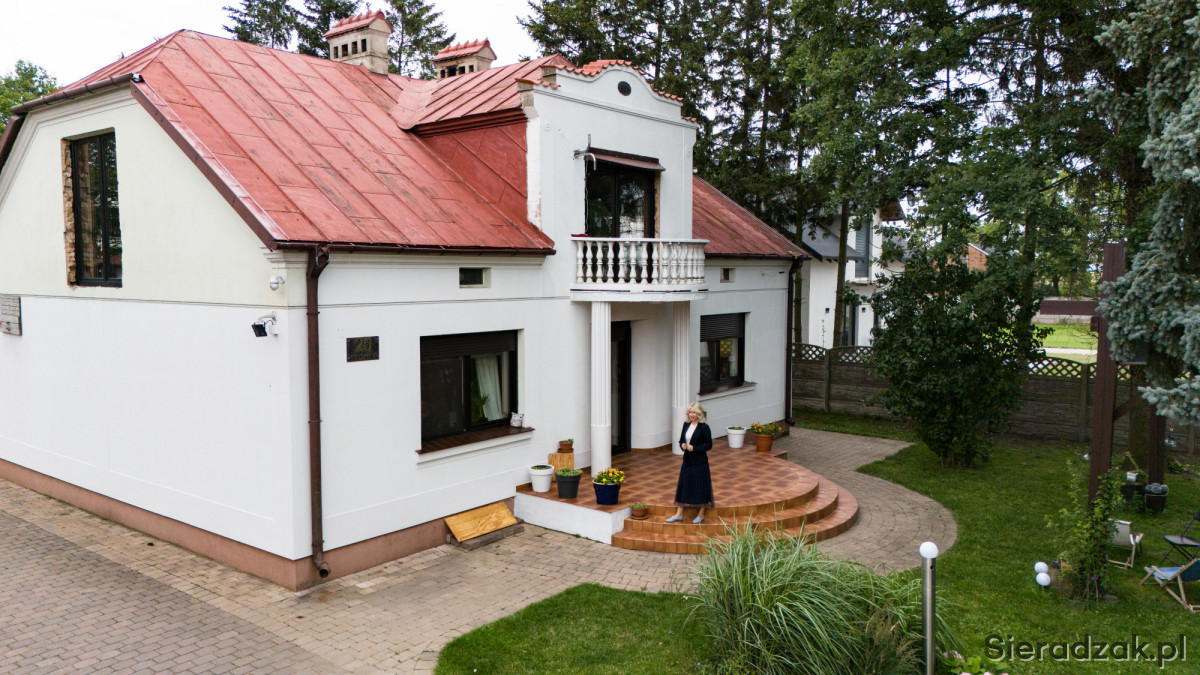 Dom zachwyca szerokim frontem, centralnie usytuowanym wejściem oraz półokrągłym balkonem wspartym na ozdobnych kolumnach.