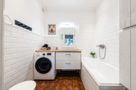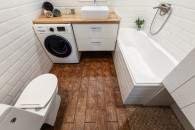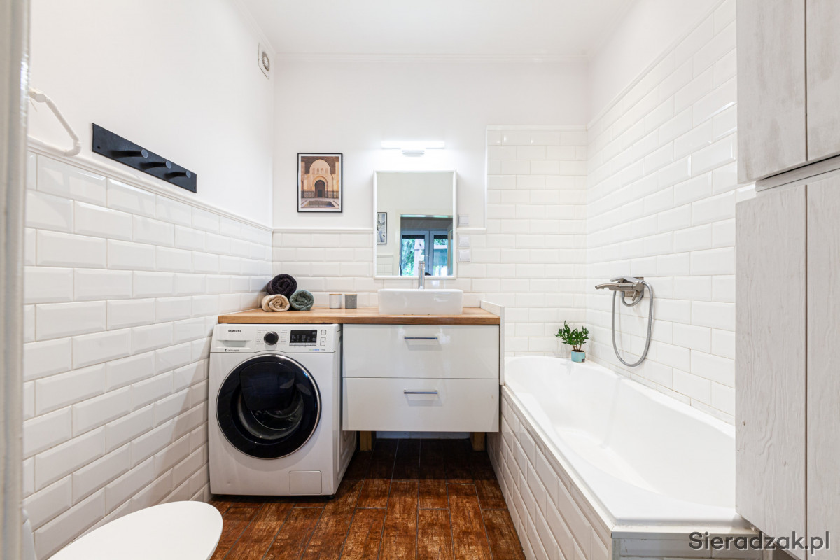 Elegancka łazienka w białych kolorach z drewnianymi elementami oferuje relaks w wannie po długim dniu.