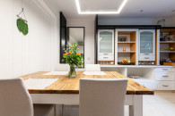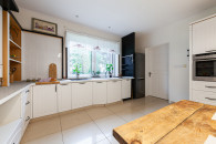 Przedsionek prowadzi do dużej, stylowej kuchni, która jest sercem tej posiadłości. Białe szafki rozjaśniają wnętrze, a duże okno oferuje widok na przepiękny ogród. Centralnie umieszczony duży stół idealnie nadaje się na rodzinne posiłki. Jest wyposażona w cały sprzęt AGD.