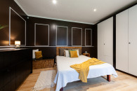 Na lewo od wejścia mieści się piękna, klimatyczna sypialnia z dużym łóżkiem i oknem z widokiem na uspokajającą zieleń.