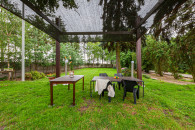 Drugi ganek prowadzi na półokrągły taras, z którego wychodzimy do części ogrodu z wiatą i meblami ogrodowymi, idealnymi do wypoczynku na świeżym powietrzu.