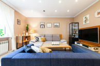 Z kuchni przechodzimy do przytulnego salonu, z którego okno wychodzi na przednią część ogrodu. Znajdują się tutaj dwie wygodne kanapy, stolik kawowy i duży telewizor.