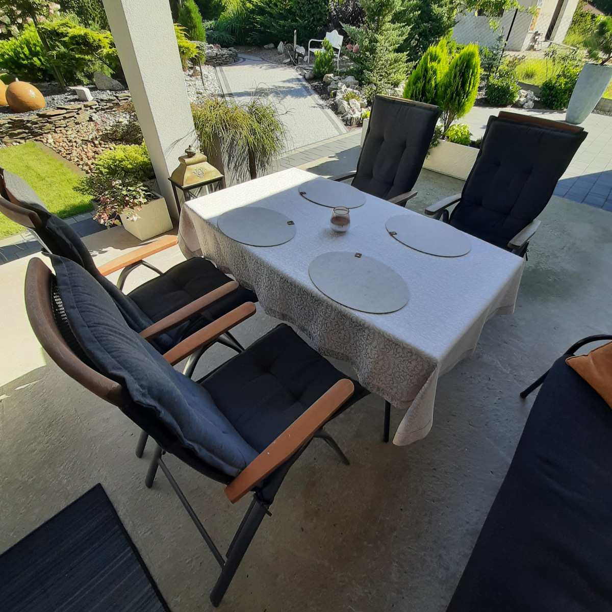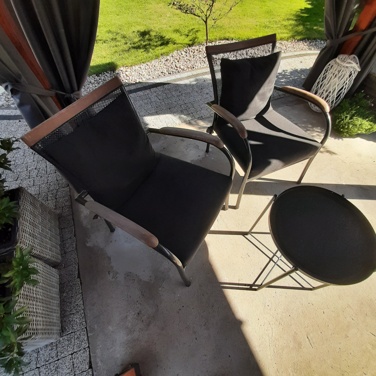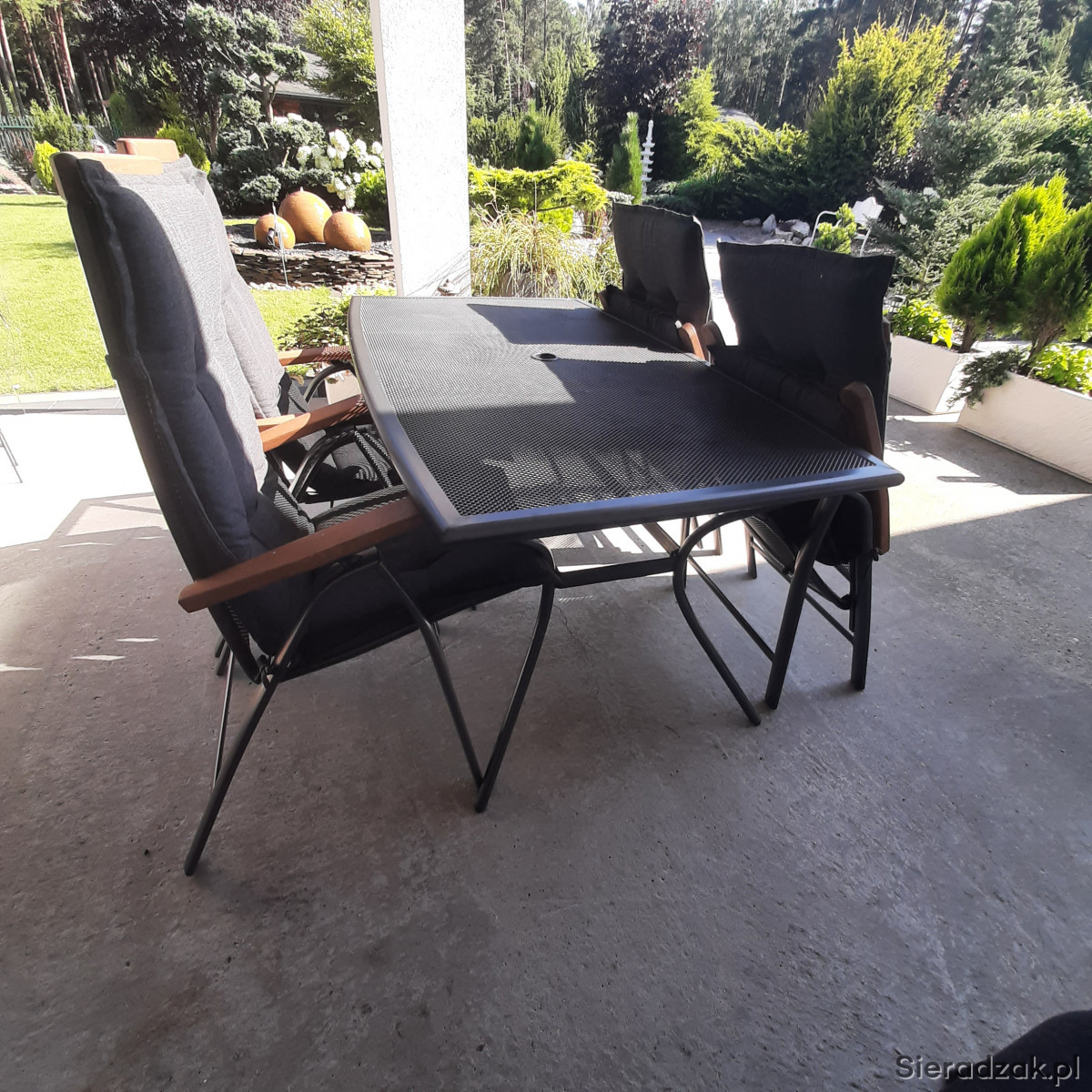 Stół ogrodowy ( jysk Larvik ) + 6 krzeseł wraz z materiałem na siedziska. Stół uzywany w b.dobrym stanie. Krzesła z regulowanym oparciem. Sprzedam całość razem.