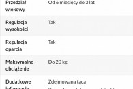 Dzięki szerokiej, regulowanej tacce, dziecko będzie miało dużo miejsca zarówno na posiłki, jak i swoje zabawki. Tacka posiada dwie funkcje - może służyć zarówno jako stoliczek na posiłki i zabawki, ale także, dzięki barierce krokowej, zabezpiecza dodatkowo dziecko przed wypadnięciem. Tackę w każdej chwili można wymontować i zawiesić z tyłu krzesełka. Dodatkowo krzesełko posiada podłokietniki, które w razie potrzeby można złożyć. Krzesełko obite jest łatwą do utrzymania w czystości tapicerką wykonaną z nietoksycznego PCV.