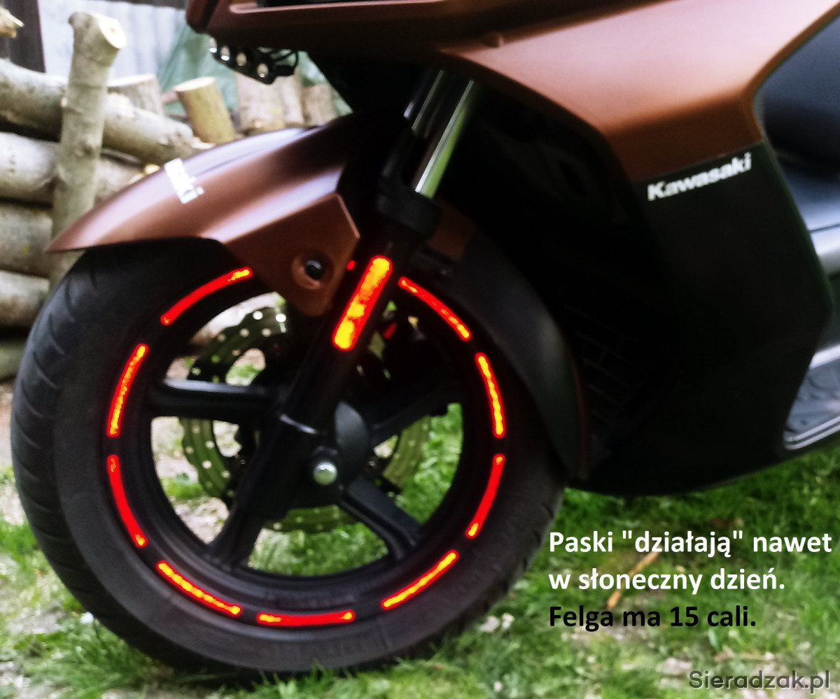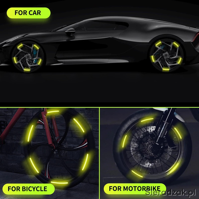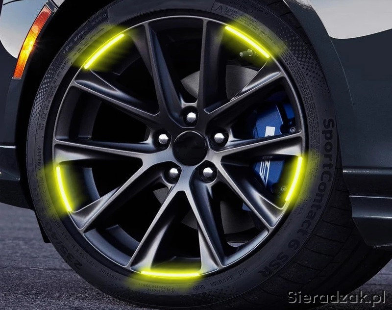 Naklejki odblaskowe na koła samochodu, motocykla lub skutera. Poprawiają widoczność i bezpieczeństwo na drodze, a przy okazji tworzą wizualny efekt w nocy.