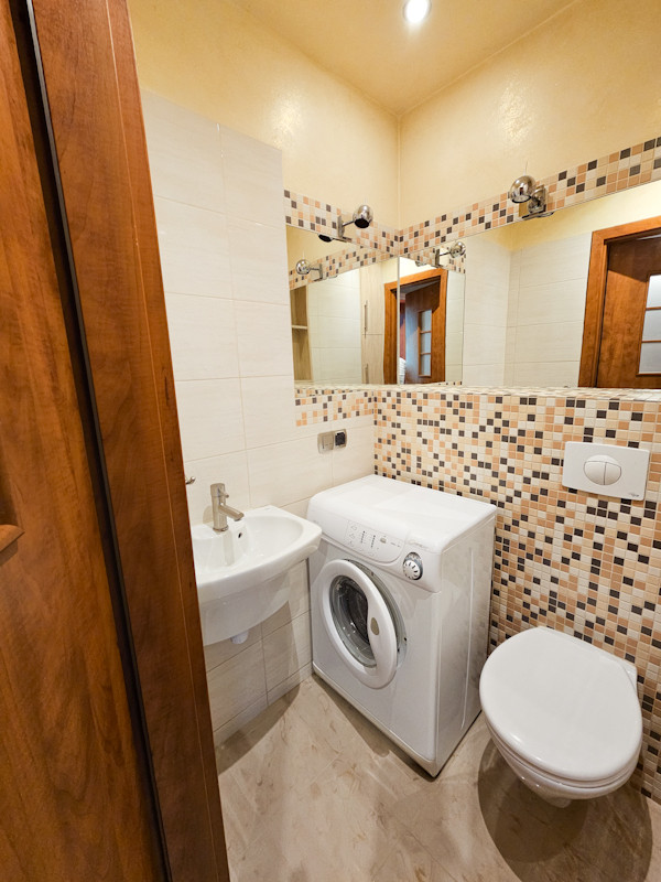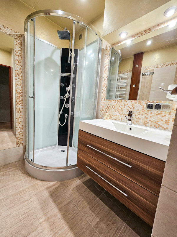 Łazienka wyposażona w kabinę prysznicową oraz osobne WC wraz z pralką i umywalką umożliwiają niezależne korzystanie z pomieszczeń podczas wieczornej czy porannej toalety.