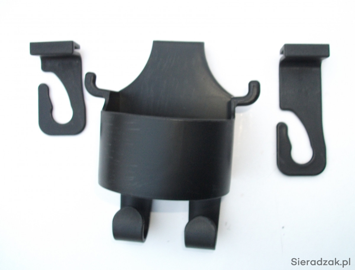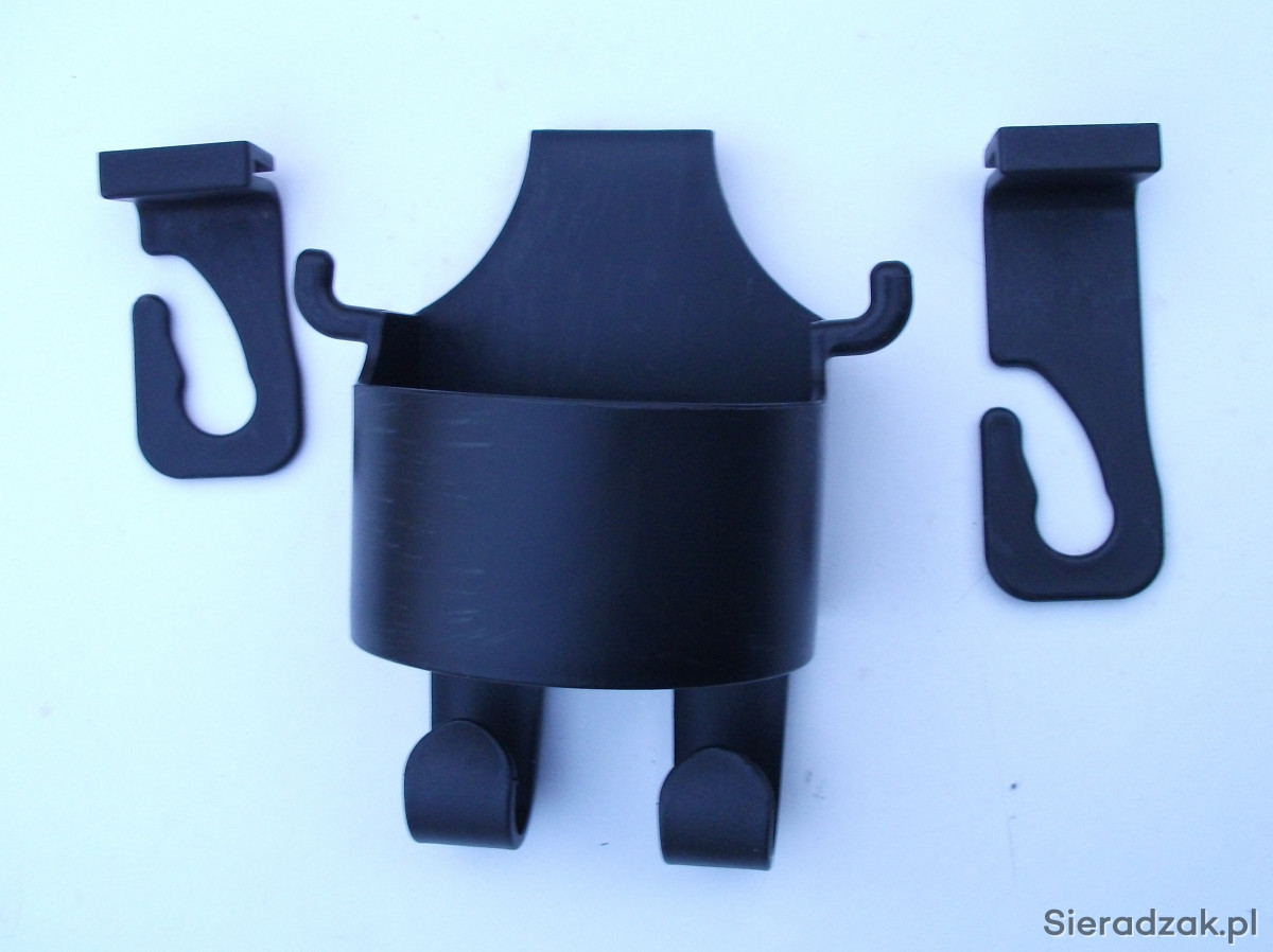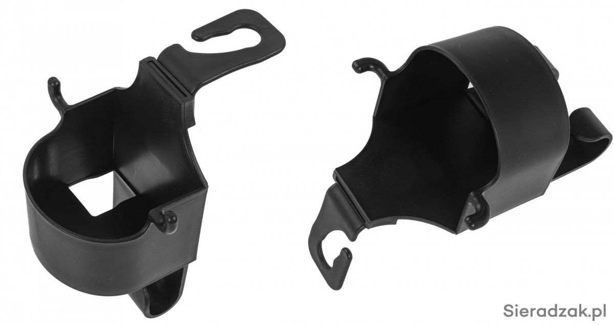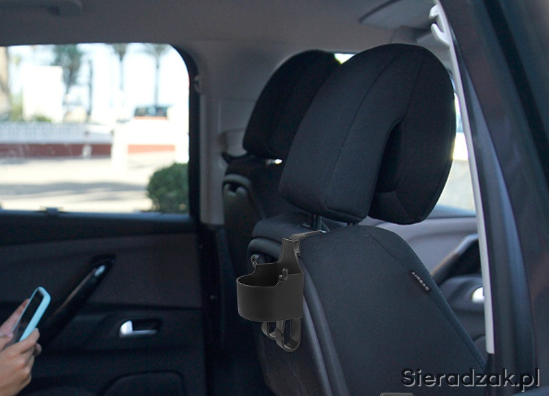 Samochodowy uchwyt na kubek zawiesza się na sztycy zagłówka za pomocą jednego z dwóch rodzajów haczyka.