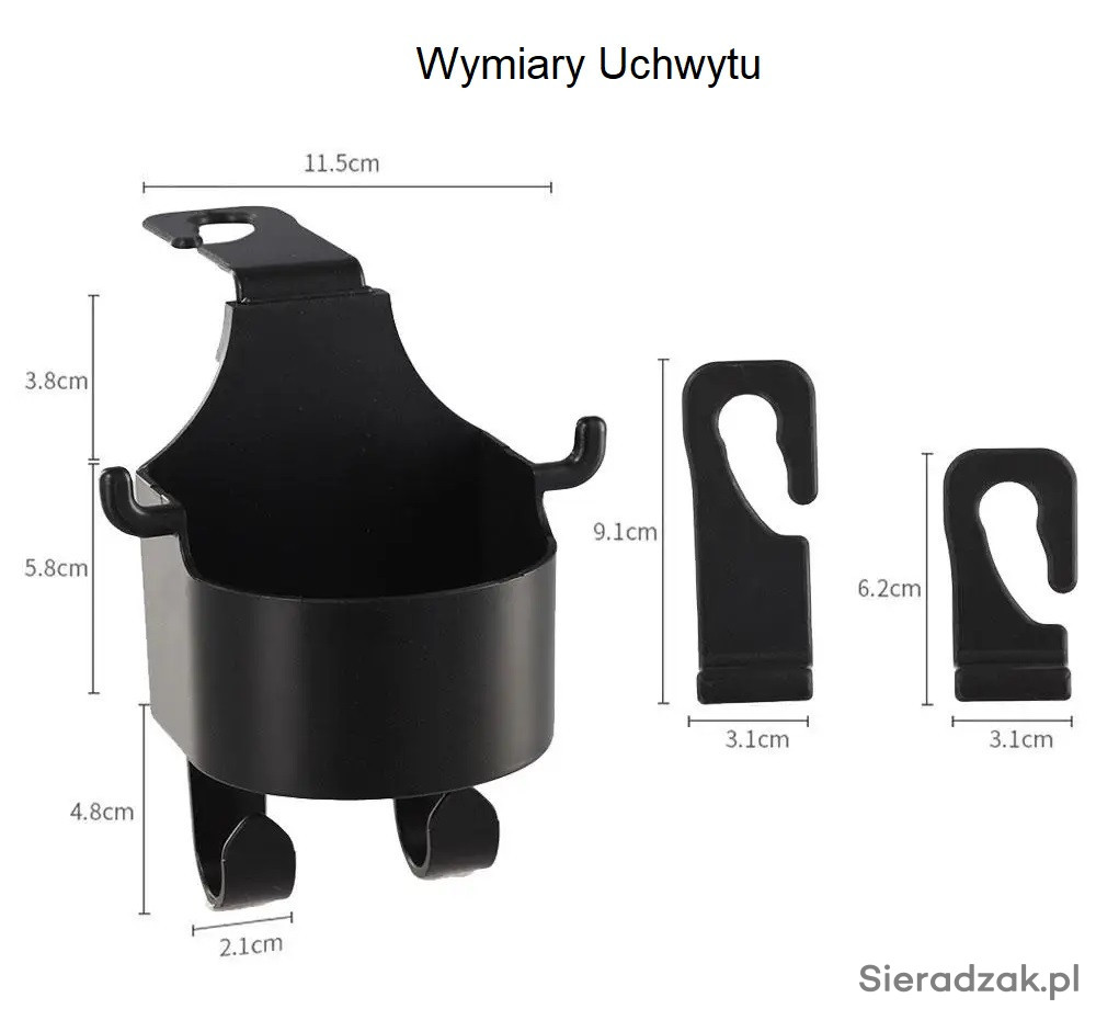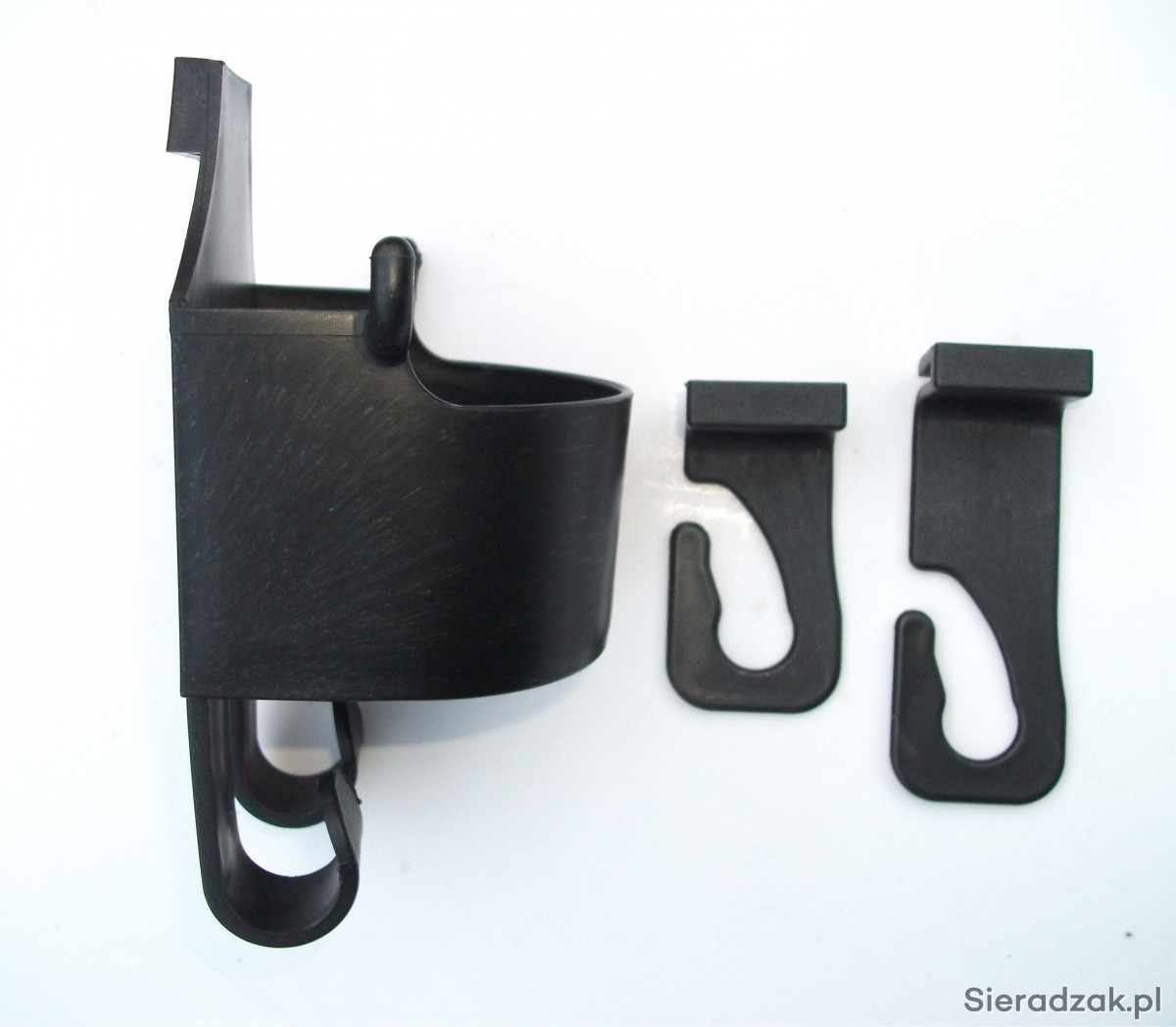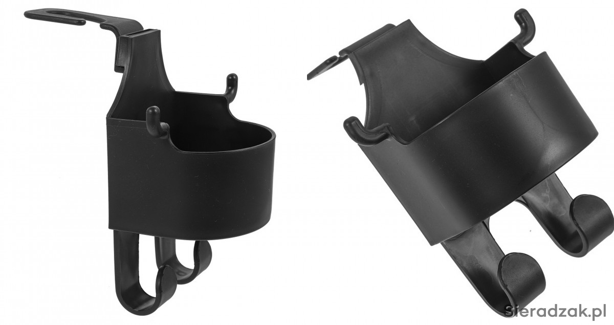 Samochodowy uchwyt na kubek zawiesza się na sztycy zagłówka za pomocą jednego z dwóch rodzajów haczyka.