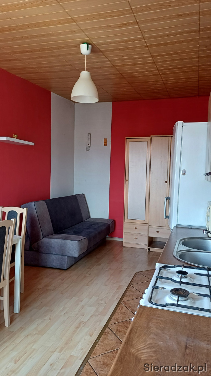 Duży pokój przerobiony jest na salon z aneksem kuchennym. Mieszkanie posiada balkon - widok na ulicę Szkolną.
