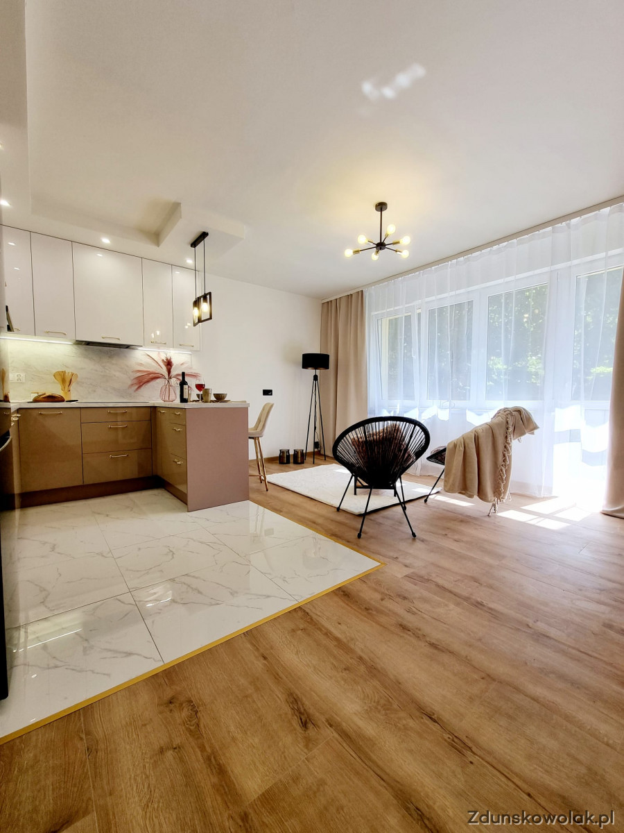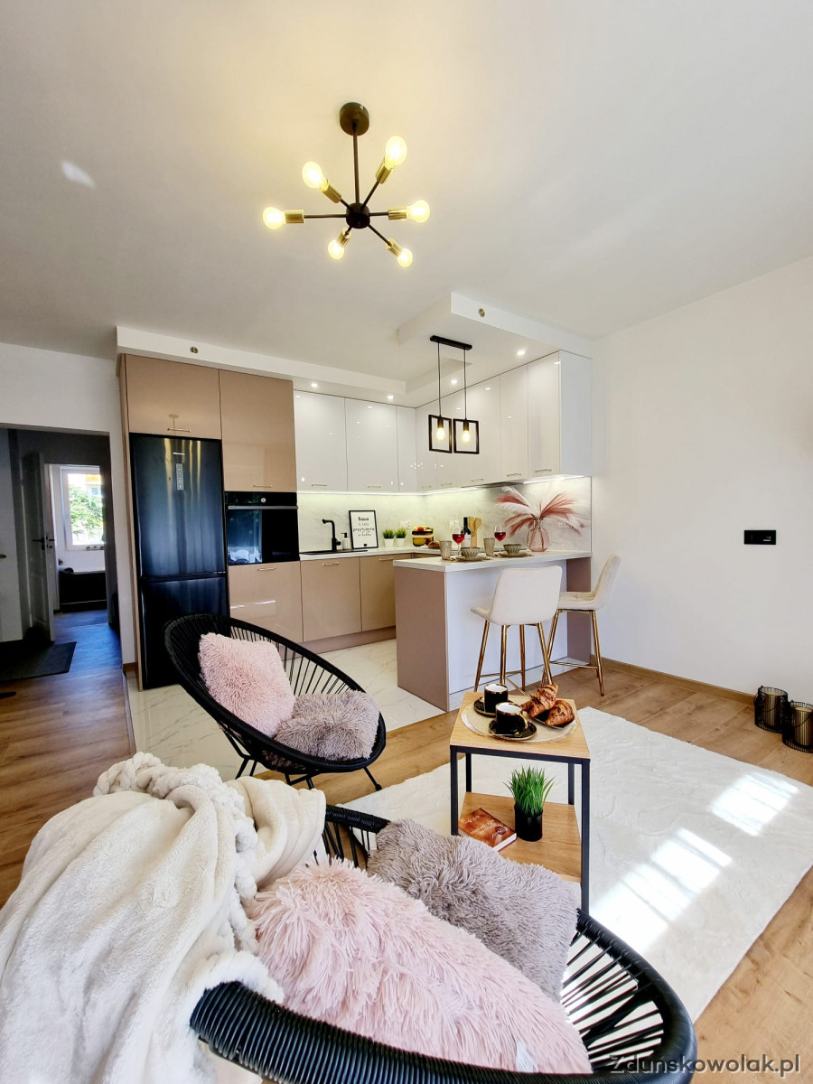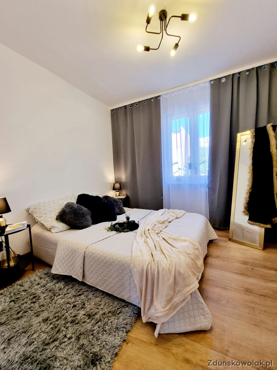 W skład mieszkania wchodzą dwie sypialnie, salon z aneksem kuchennym, łazienka oraz osobna toaleta. Kuchnia została zaprojektowana na wymiar, z nowymi meblami oraz sprzętem AGD objętym gwarancją. Nowoczesna glazura i terakota podkreślają elegancję wnętrza, a nowe podłogi dodają mu ciepła i przytulności. Dodatkowym atutem mieszkania jest balkon typu loggia, idealny na poranną kawę lub chwilę relaksu na świeżym powietrzu. Mieszkanie jest bardzo funkcjonalne – posiada także okno w łazience, które zapewnia naturalne doświetlenie i wentylację.