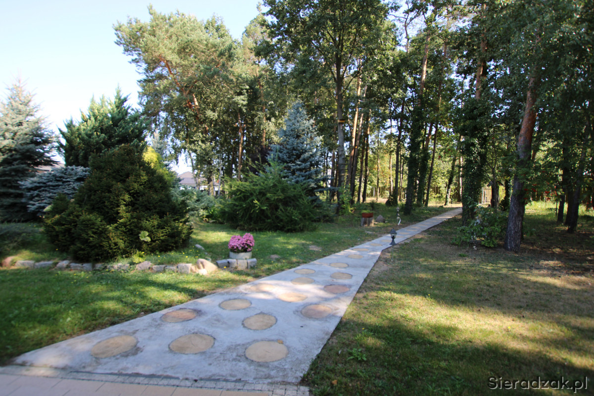 Front działki stanowiący wjazd oraz dojście od furtki został zagospodarowana kostką brukową i chodnikiem, pozostała część to trawnik z wieloletnimi nasadzeniami krzewów ozdobnych oraz użytkowych- maliny, jeżyny z wygospodarowanym miejscem na przydomowy warzywnik oraz miejscem zabaw dla dzieci z architekturą ogrodową w postaci domku i huśtawki, niewielkiego stawiku.