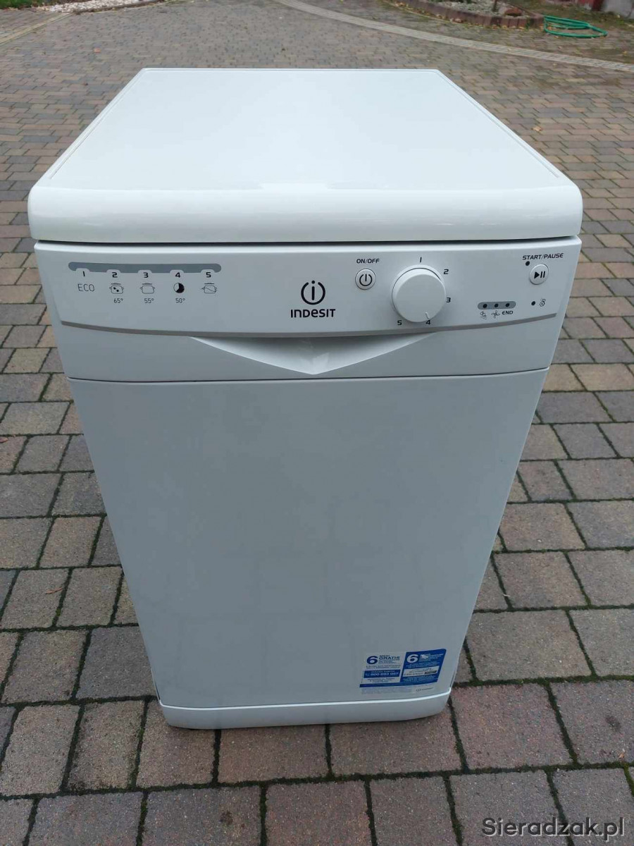 Zmywarka wolnostojąca Indesit DSR 15B1 w kolorze białym. Sterowana pokrętłem oraz przyciskami. Pomocnym rozwiązaniem są wskaźniki, które informują o konieczności uzupełnienia braku soli czy nabłyszczacza.