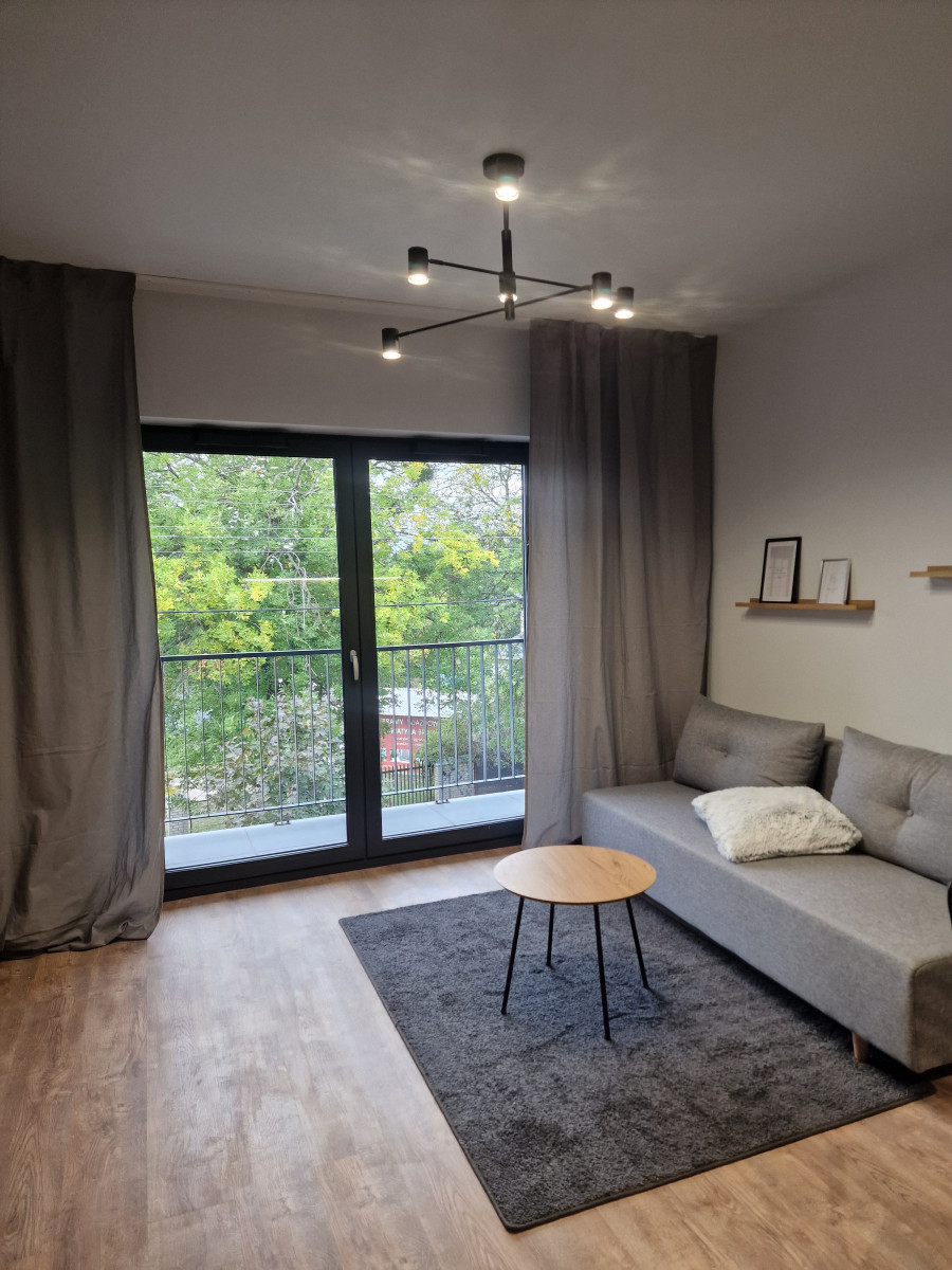 Z pokoju dziennego prowadzi bezpośrednie wyjście na balkon, który stanowi dodatkową strefę relaksu na świeżym powietrzu. Dodatkowa powierzchnia balkonu pozwala na ustawienie mebli ogrodowych, idealnych do porannej kawy lub wieczornego odpoczynku. Widok z balkonu dodaje wnętrzu jeszcze większej atrakcyjności, a dostęp do naturalnego światła rozjaśnia cały pokój dzienny, tworząc jasną i przytulną przestrzeń.