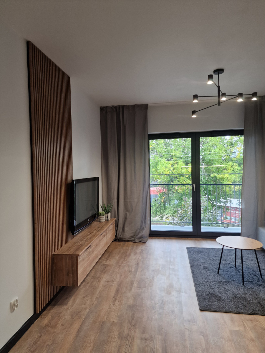 W pokoju dziennym znajduje się wygodna szara kanapa, która stanowi centralny punkt relaksu. Obok niej ustawiony jest stylowy stolik kawowy, idealny na filiżankę kawy lub książkę. Na ścianie wisi nowoczesny telewizor, który doskonale uzupełnia przestrzeń, zapewniając komfortowe warunki do oglądania filmów czy ulubionych programów. Całość tworzy przytulne, ale jednocześnie funkcjonalne wnętrze, sprzyjające wypoczynkowi.