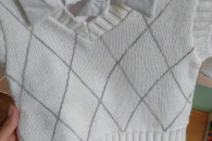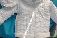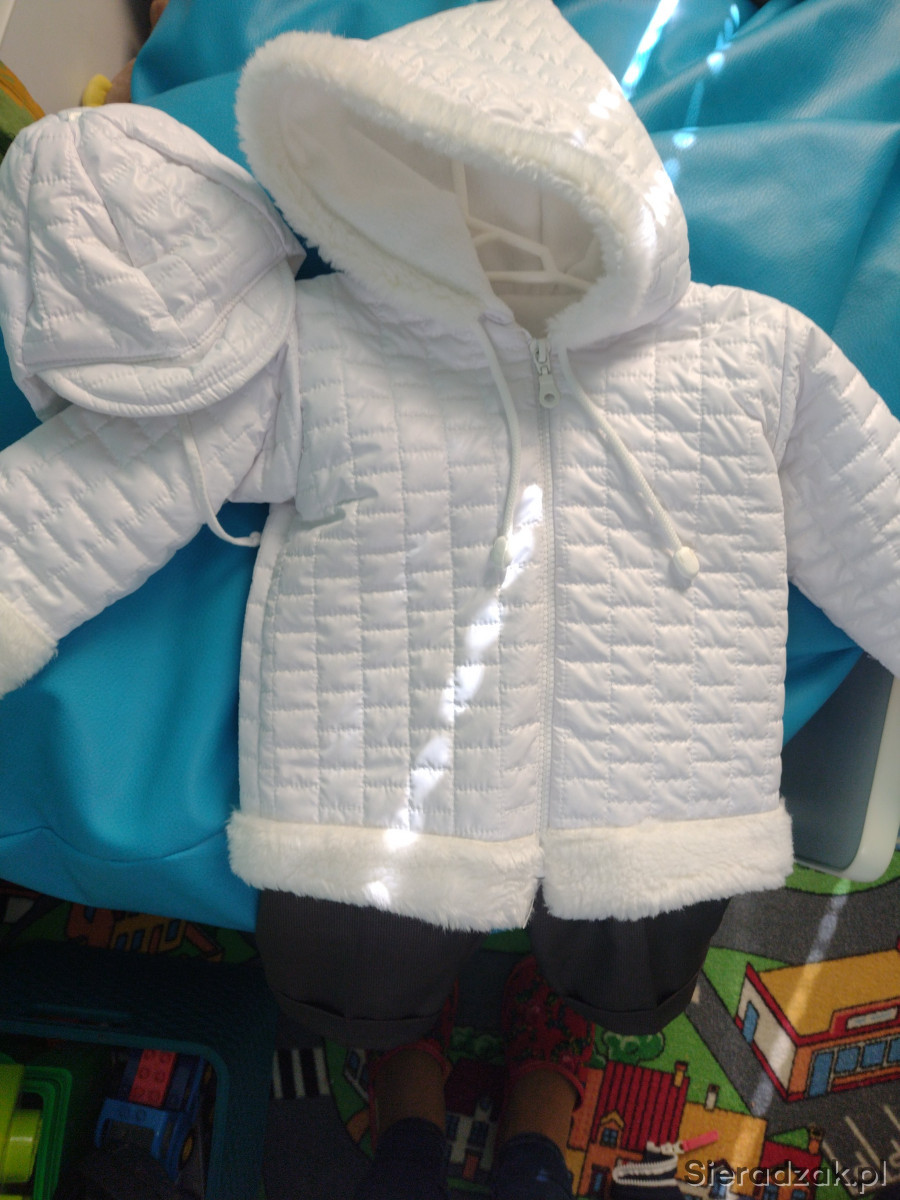 Ubranko na chrzest w sezonie zimowym, jesiennym i wczesnowiosennym. Buciki, pikowana kurteczka, czapka pilotka, koszula, sweterek, spodnie z ocieplaczem. Rozmiar 74.