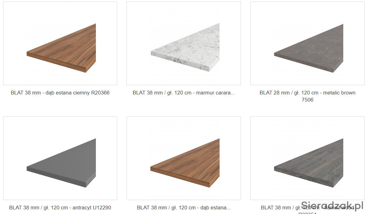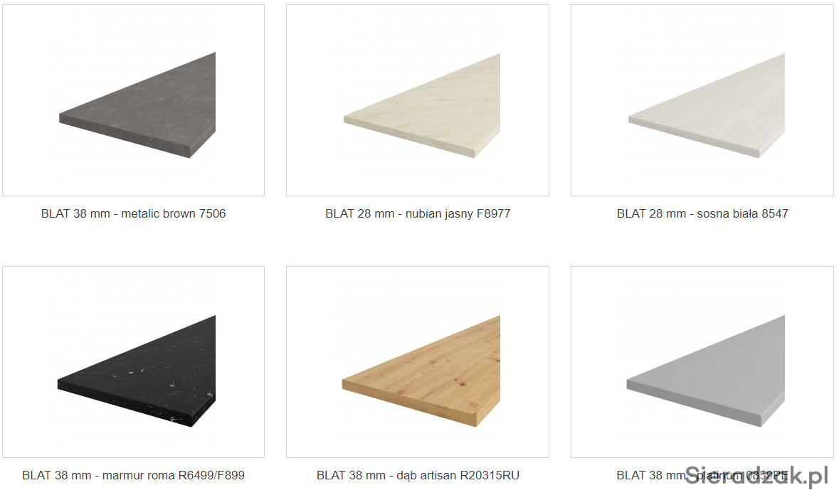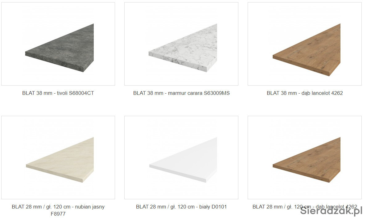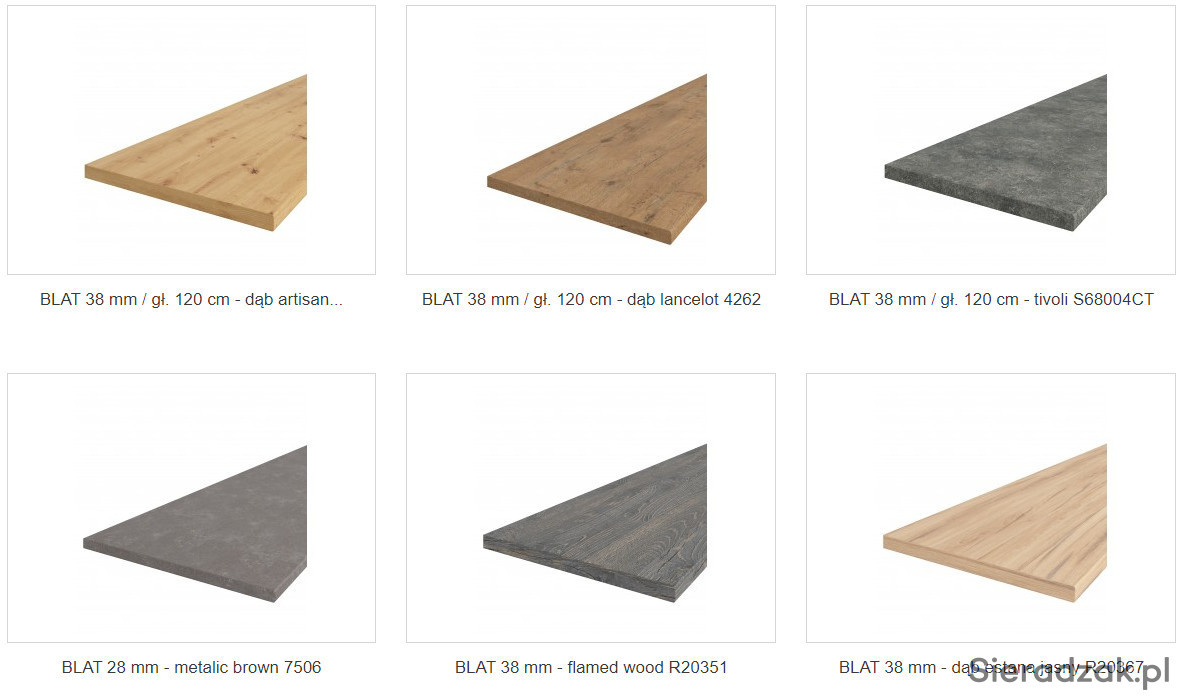 W skład zestawu kuchennego wchodzą blaty o długościach 270cm, 145 cm. Grubość tych blatów wynosi 38 mm.