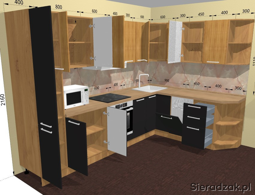 Zestaw Kuchenny MODENA 255cm*175cm. z blatem to przykład kuchni wielofunkcyjnej, w której znalazło się miejsce na zmywarkę, oraz piekarnik z płytą indukcyjną.