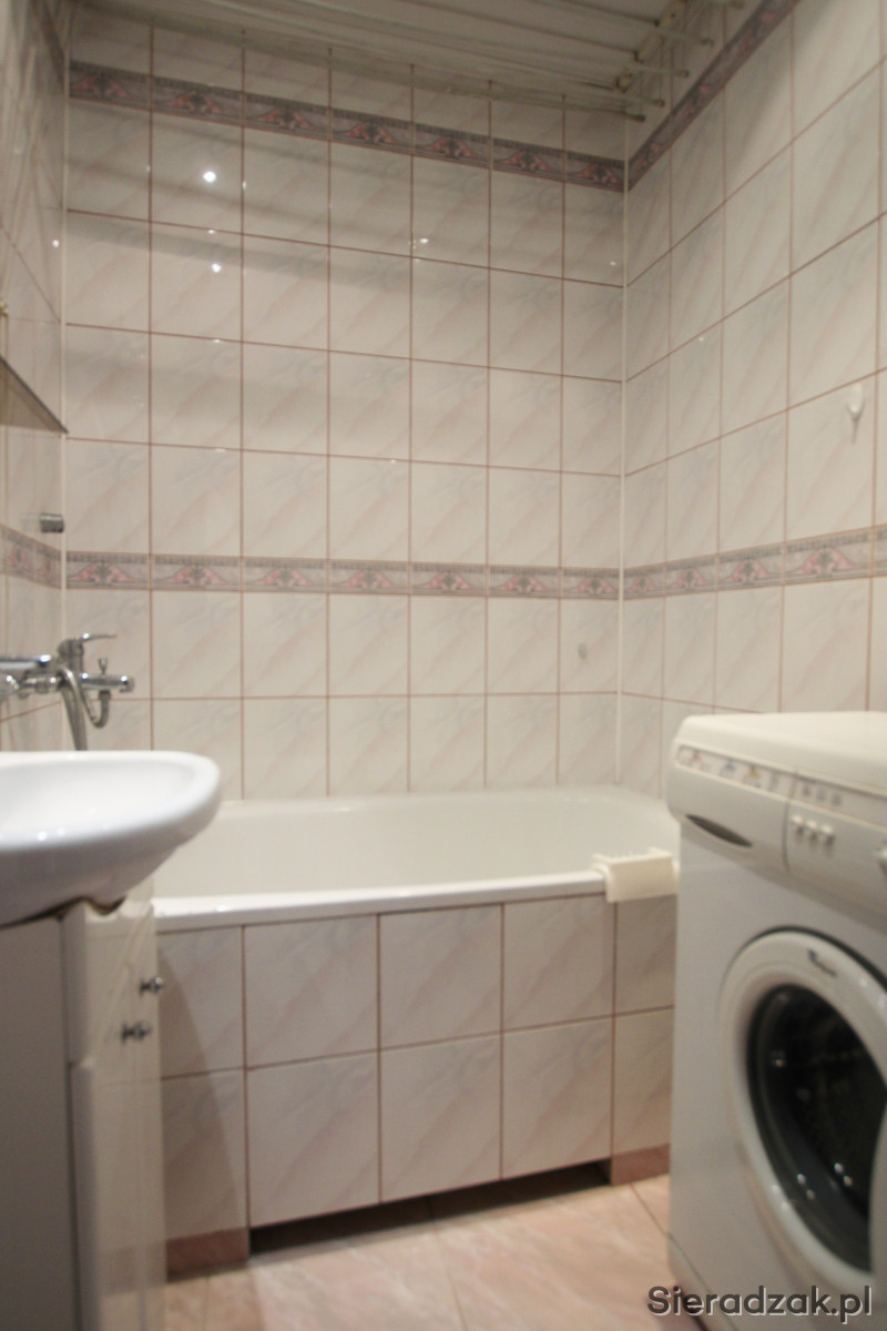 Łazienka to oddzielne pomieszczenie wyposażone w wannę, umywalkę oraz pralkę. Glazura i terakota w dobrym stanie.