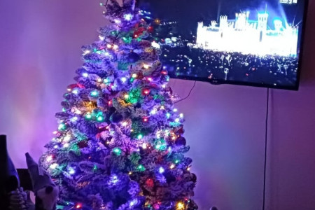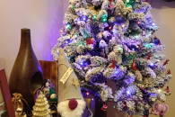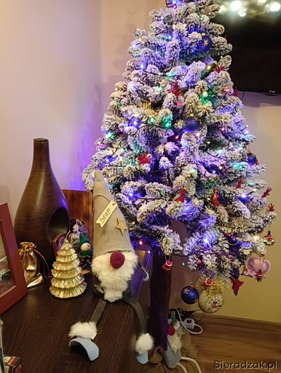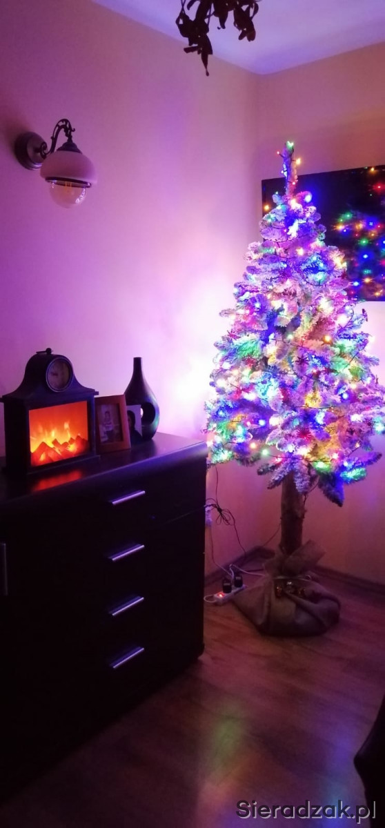 Sztuczna choinka - biała "ośnieżona", na masywnym pniu. Wysokość ok. 2,05 m. Kompletna, z podstawą i workiem jutowym. Na zdjęciach oświetlona lampami LED, dlatego kolorowa.