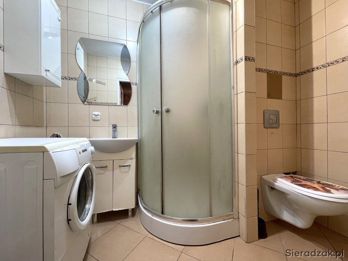 Łazienka z WC wyposażona w kabinę prysznicową oraz pralkę.